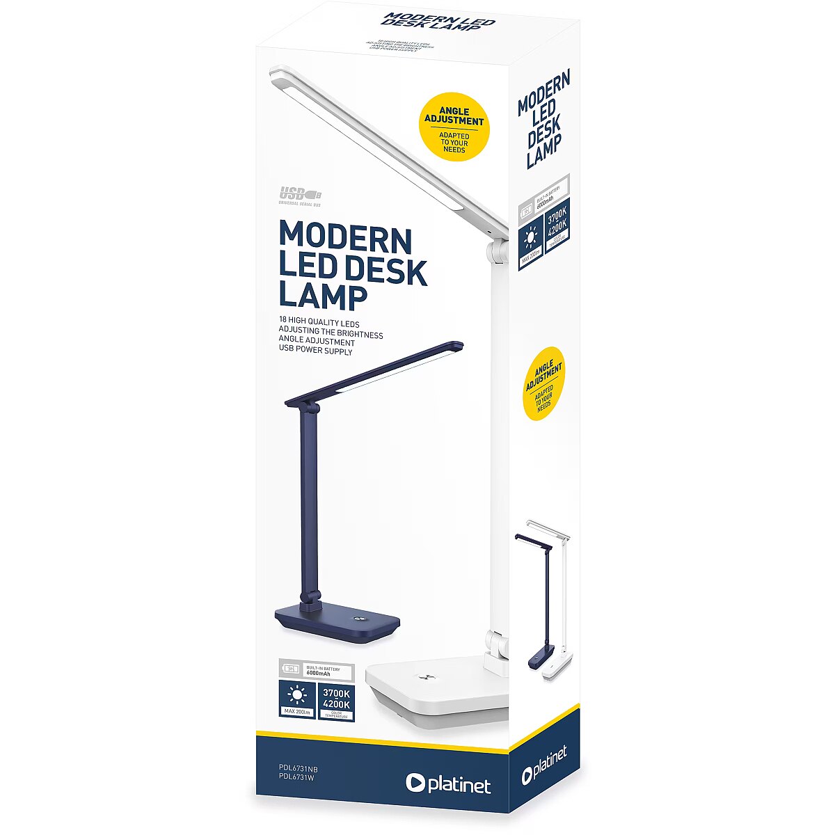 Sisseehitatud 6000 mAh aku võimaldab lampi kasutada kõikjal, sõltumata elektripistikupesade olemasolust. Standardne microUSB pistik võimaldab laadida akut traditsioonilise USB-laadijaga, mida kasutatakse nutitelefonide või tahvelarvutite laadimiseks. Lambi tööaeg on 8 tundi ja laadimisaeg 14 tundi. Integreeritud akuga laualamp 18 kvaliteetset LED-i Reguleeritav kaldenurk Valgustemperatuur: 3700–4200 K Stiilne ja minimalistlik disain Võimsus: 5 W Valgusvoog: 200 lm Komplektis 0,9 m USB kaabel Tööaeg: 8 h Laadimisaeg: 14 h Aku: 6000 mAh Mõõdud: 310 × 125 × 369 mm