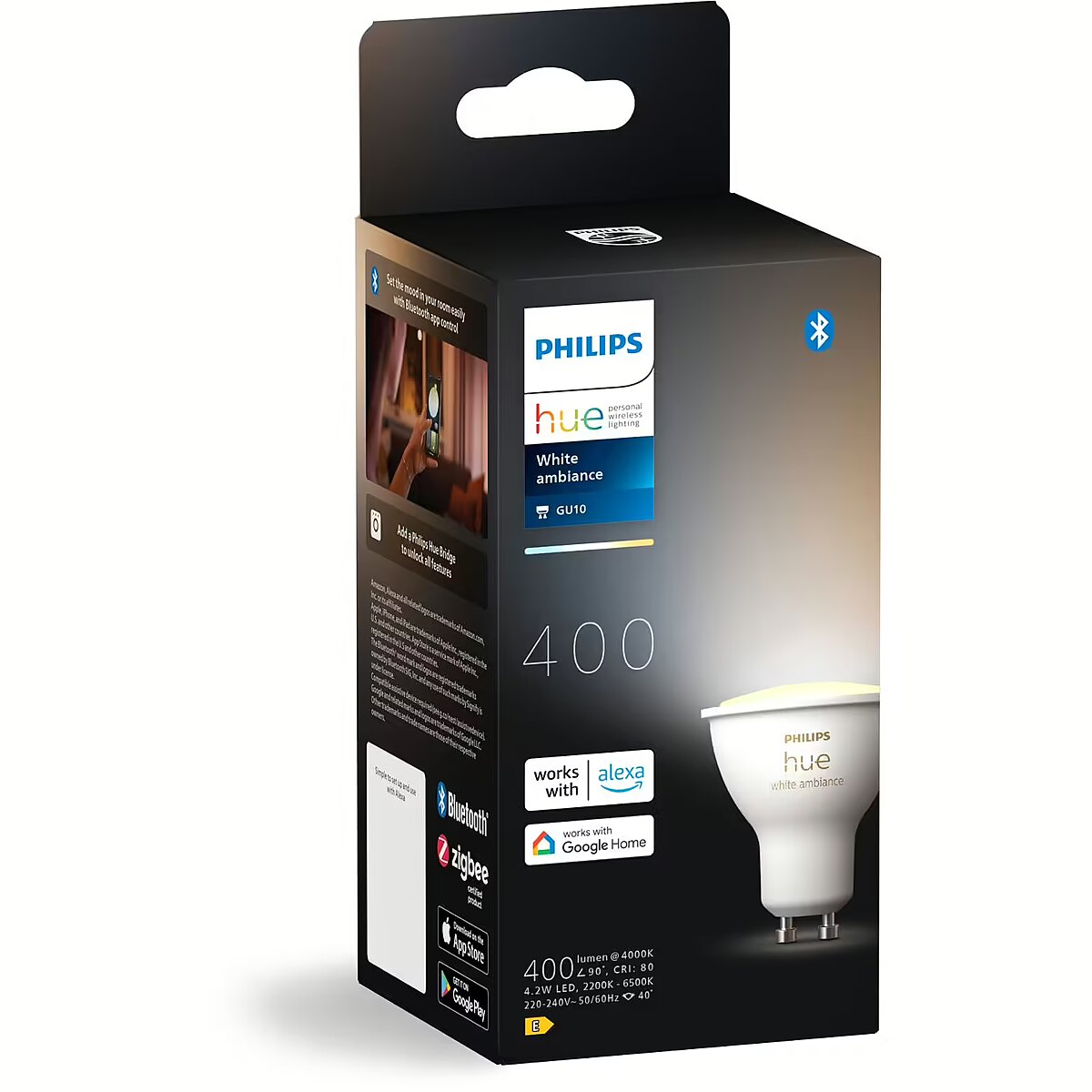 LongSummaryDescription - Philips Hue White ambience GU10 – smart spotlight. Type: Smart bulb, Interface: Bluetooth/Zigbee, Product colour: White. Energy efficiency class: E, Power consumption (standby): 0.25 W, Power consumption (max): 4.2 W. Width: 50 mm, Depth: 50 mm, Height: 57 mm. Package type: Box, Package width: 72 mm, Package depth: 72 mm. Quantity per pack: 1 pc(s), Number of hue bulb(s) included: 1 bulb(s)