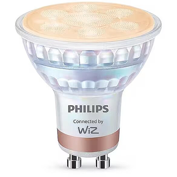 MediumDescription EN - Philips WiZ GU10 smart bulbs bring adjustable white light and smart control to your home. These elegant, glass-bodied spotlights fit standard fixtures and connect directly to your Wi-Fi—no hub required.