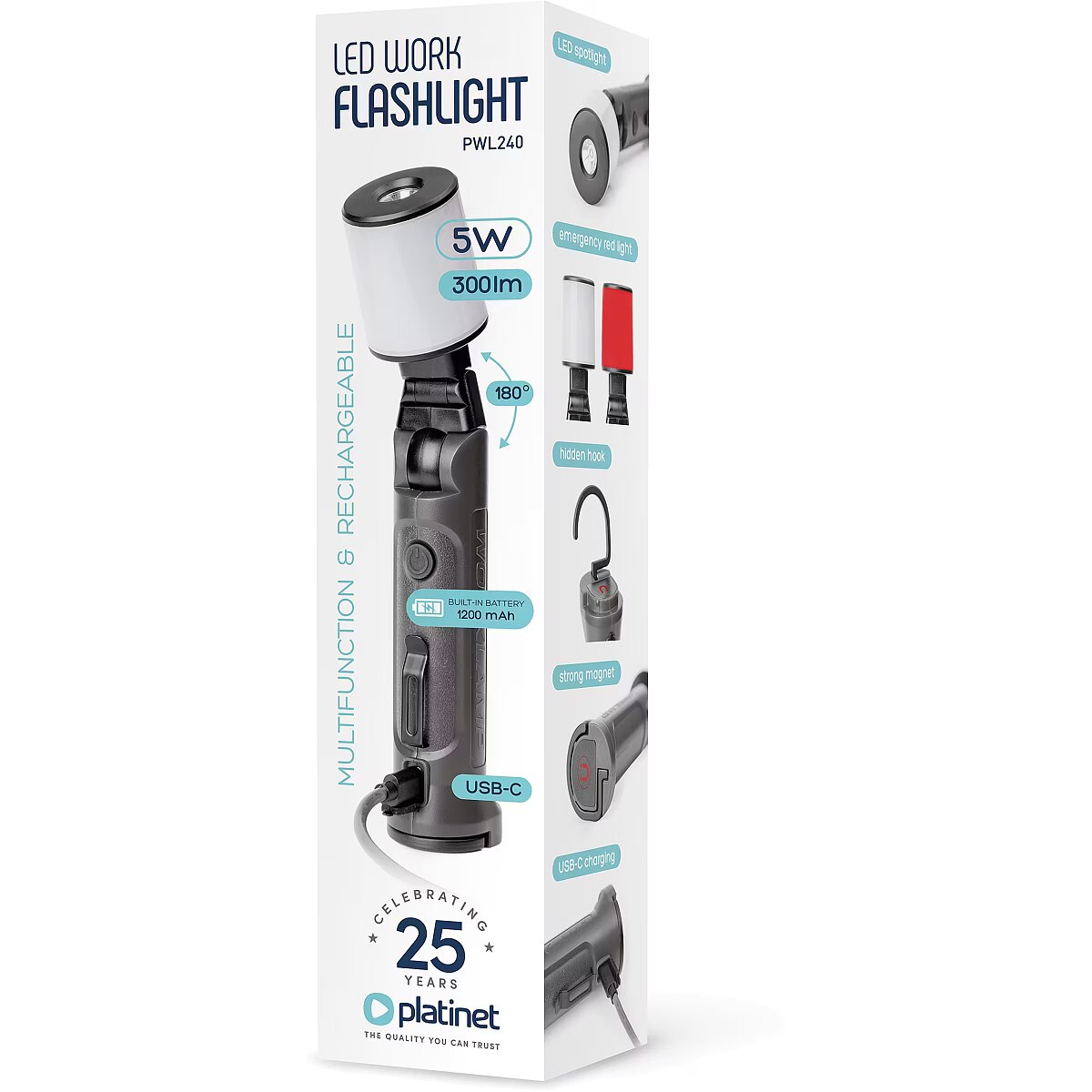description_en - The reliable LED workshop lamp 5 W is a practical light source that will work well in any garage, workshop or construction site. Thanks to the built-in magnet and hook, you can attach it wherever you need it and have your hands free to work. Bright, neutral light of 6000 K guarantees comfort and precision, and 5 lighting modes allow you to adjust the intensity to any situation. Compact, lightweight and always ready for action! 5 operating modes allow you to adjust the light to your current needs Bright, neutral 6000 K light ideal for work in the workshop, garage or construction site Built-in magnet and hook allow you to attach the lamp in hard-to-reach places - both hands free for work Compact dimensions - fits in your pocket or toolbox Fast USB-C charging (2 h) and up to 8 hours of operation on a single charge Durable construction, resistant to workshop conditions Luminous flux: 300 lm Power: 5 W Battery: 1200 mAh Voltage: 5 V 1 A Dimensions: 40 × 40 × 215 mm