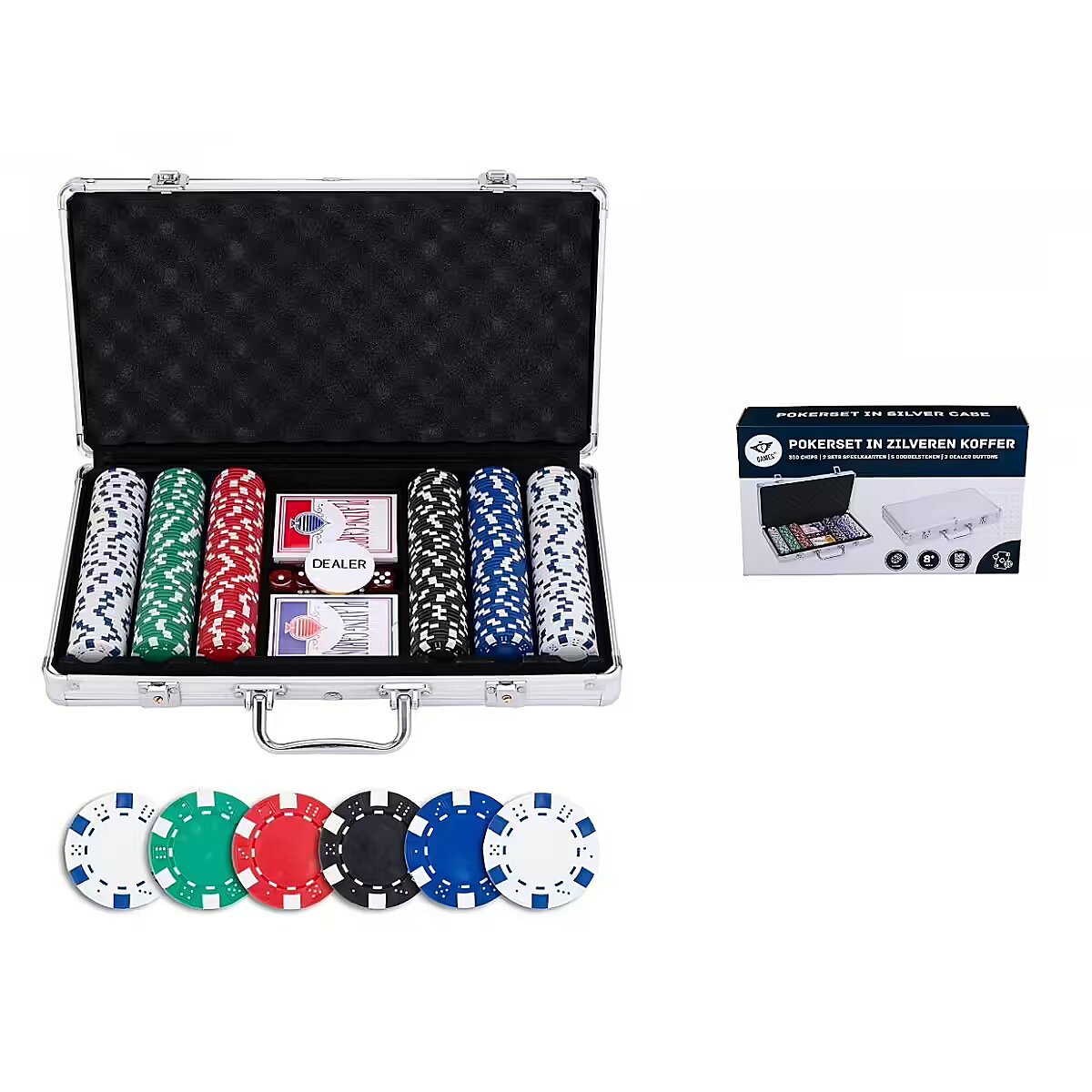 Description - Zestaw do pokera 300 standard Zestaw do pokera zawiera dwie talie kart, 300 żetonów Dice o masie 11,5 g (bez nominałówi), trzy znaczniki krupiera, pięć kości i srebrne etui z zaokrąglonymi rogami.