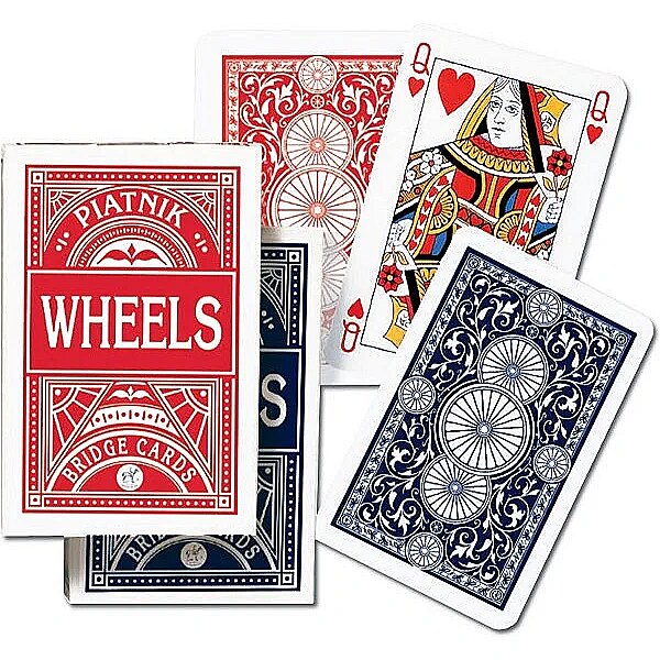 Description - The popular Wheels Cards with a canvas texture, very popular with the Polish public. The decks consist of 55 plastic cards measuring 58 x 89 mm with a weight of 310. Ideal for bridge, poker, rummy as well as other games. Two designs. Product sent at random, it is not possible to choose a specific model. Price is for 1 pc.