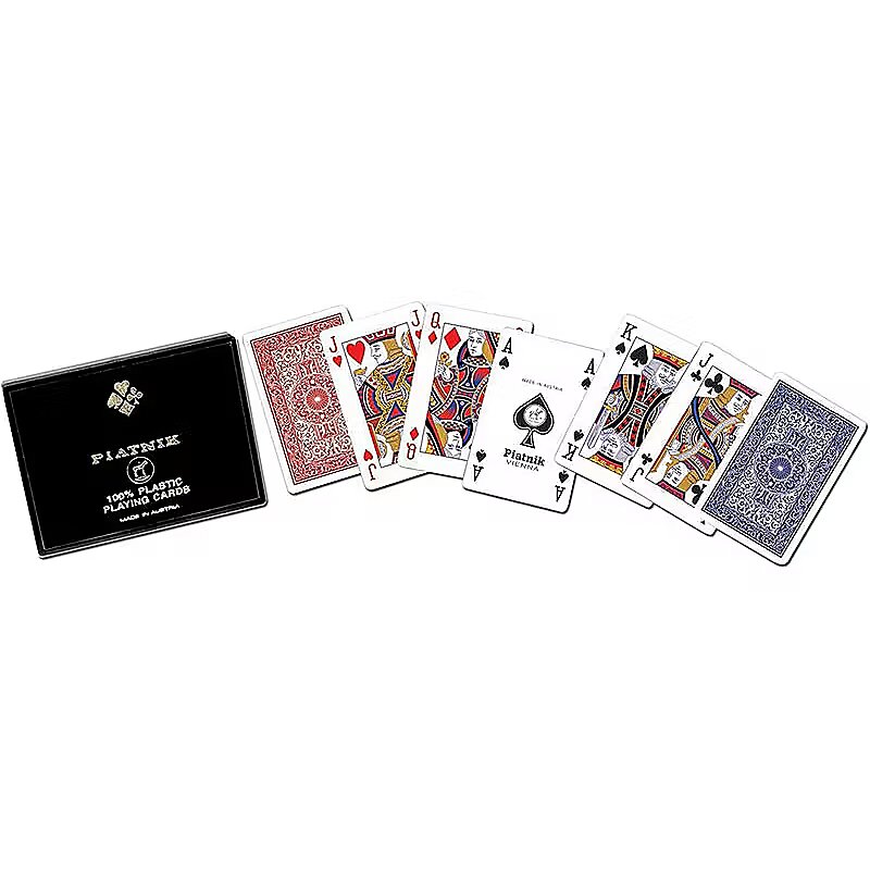 Description - The black, traditional box contains 2 decks, consisting of 55 cards measuring 58 x 89 mm. Perfect for bridge, poker, rummy and other games.