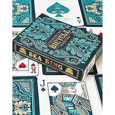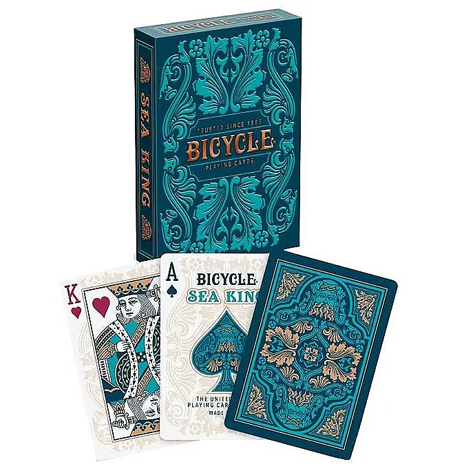 Description - Bicycle Sea King The Bicycle Sea King cards are a richly detailed deck with sea and turquoise colours. Combined with beautifully decorated packaging, it really is fit for a king! Printed on classic paper with an Air-Cushion finish in the USA. Known for their high quality, they are recommended and used by many illusionists and manipulators. Their popularity has ensured their reputation for making every trick easier, and they will last much longer than a regular pack of cards. Ideal for both learning and presenting tricks. With a tradition dating back to 1885 and an earned reputation, Bicycle cards are the most recognisable and reputable cards in the world! Each deck is made from its own unique paper and coated with a specialised material. As a result, customers have trusted Bicycle products for many years. An exclusive feature of Bicycle cards is the Air Cushion finish. This secret formula makes Bicycle cards last longer, are easier to shuffle and deal which makes card play much more enjoyable! The deck contains 52 cards plus 2 Joker cards.