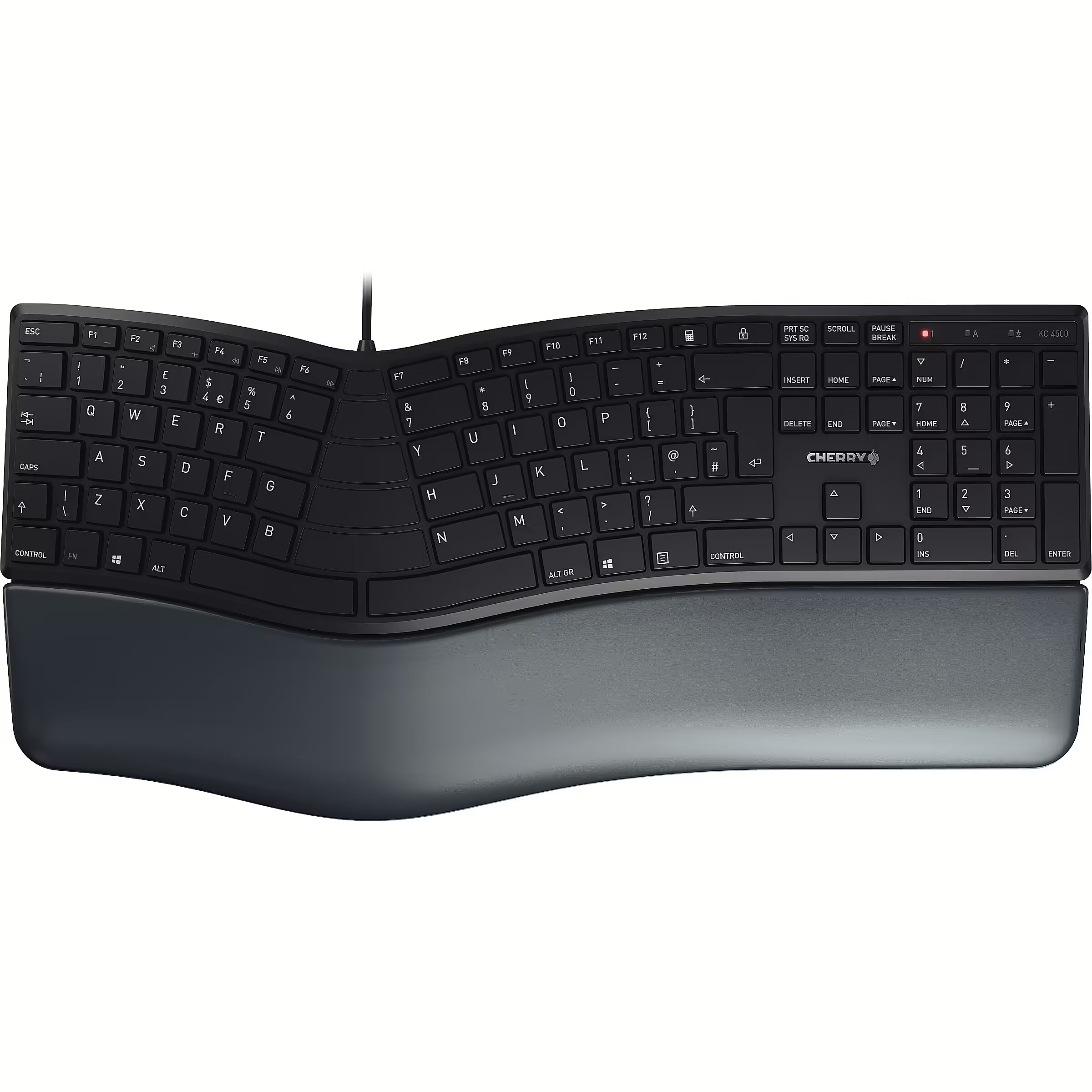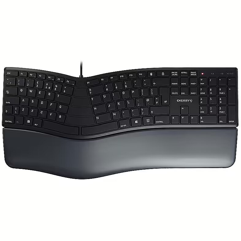 LongSummaryDescription - CHERRY KC 4500 ERGO Corded Ergonomic Keyboard, Black, USB (QWERTY - UK). Keyboard form factor: Full-size (100%). Keyboard style: Curved. Connectivity technology: Wired, Device interface: USB, Keyboard layout: QWERTY, Keyboard number of keys: 109. Wrist rest. Cable length: 1.8 m. Recommended usage: Universal. Product colour: Black