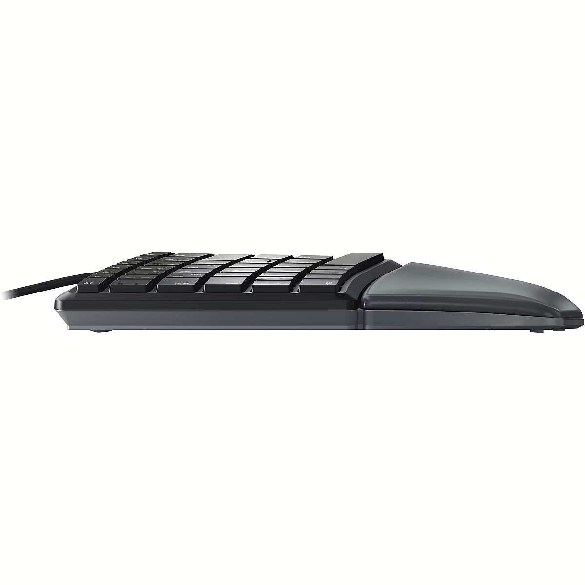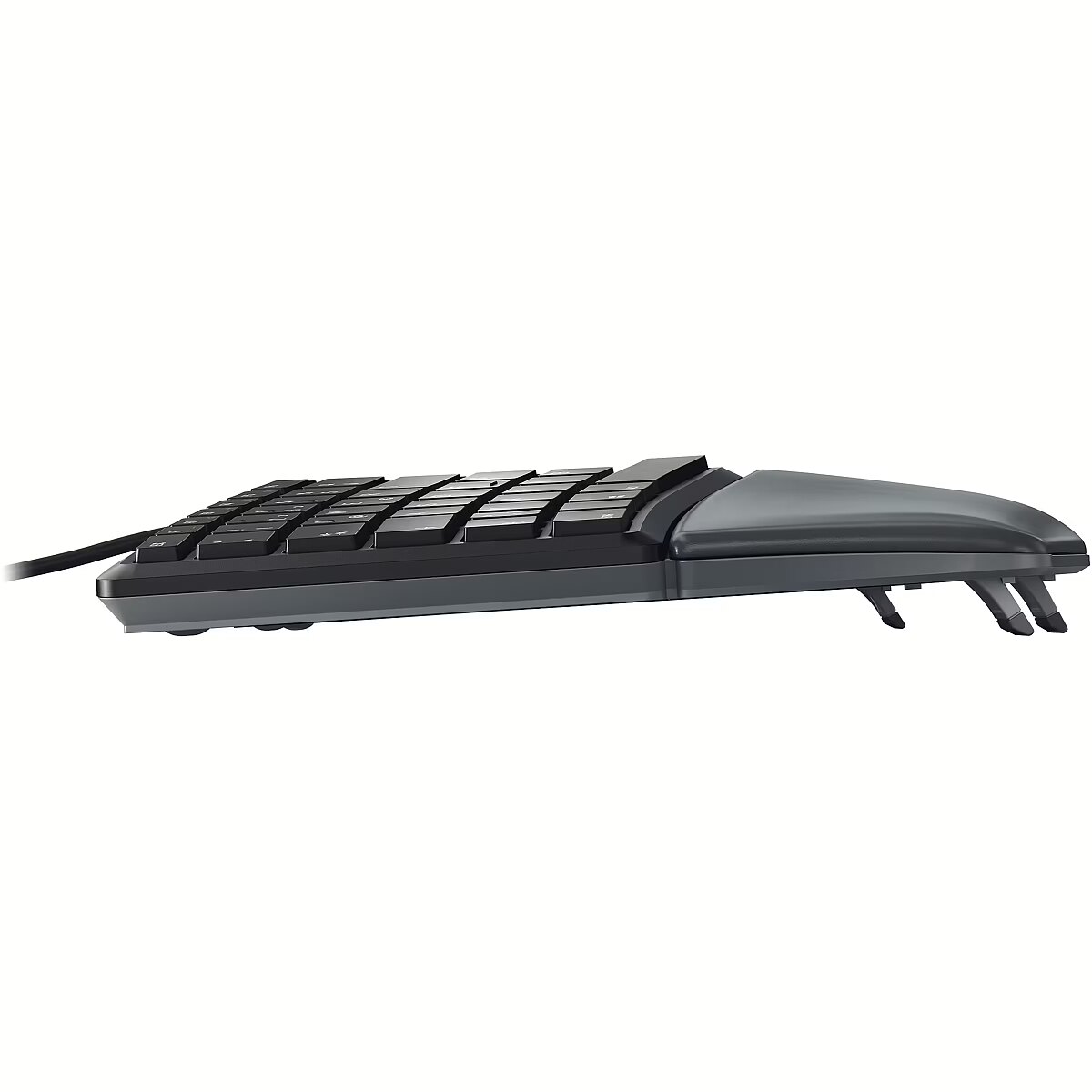 LongDesc - Do you suffer from tense shoulders, cramp or other unpleasant symptoms when working on the computer? In many cases this is caused by incorrect posture.Simple relief can be provided by an ergonomic keyboard such as the CHERRY KC 4500 ERGO. With its special design, your hands and arms take up a more natural position by themselves. This relieves your shoulders and back and your relaxed posture reduces stress. The extra-soft palm rest with memory foam prevents pressure points and lets you rest your hands comfortably.The three feet allow you to raise the front of keyboard. This position is particularly comfortable when working in a standing position. The rubber feet also reliably prevent the keyboard from slipping – whether it’s standing up or not.An extra long cable with a USB plug allows you to connect the keyboard to the computer without any problems, even if the computer is under the desk, for example. The plug & play CHERRY KC 4500 ERGO is ready for use without any additional software. With its elegant colors and modern design, it looks great on any desk.Once you’ve become used to the special design, typing is the same as on any other CHERRY keyboard: easy and uncomplicated.Multimedia functions (volume up/down/off, next/previous track, start/pause) are integrated in the F-keys. You can easily call them up by pressing the FN key at the same time. To make your daily work even easier, the free CHERRY KEYS software offers many customization options. CHERRY KEYS allows quick access to apps, files, individual text modules or macros at the touch of a key.