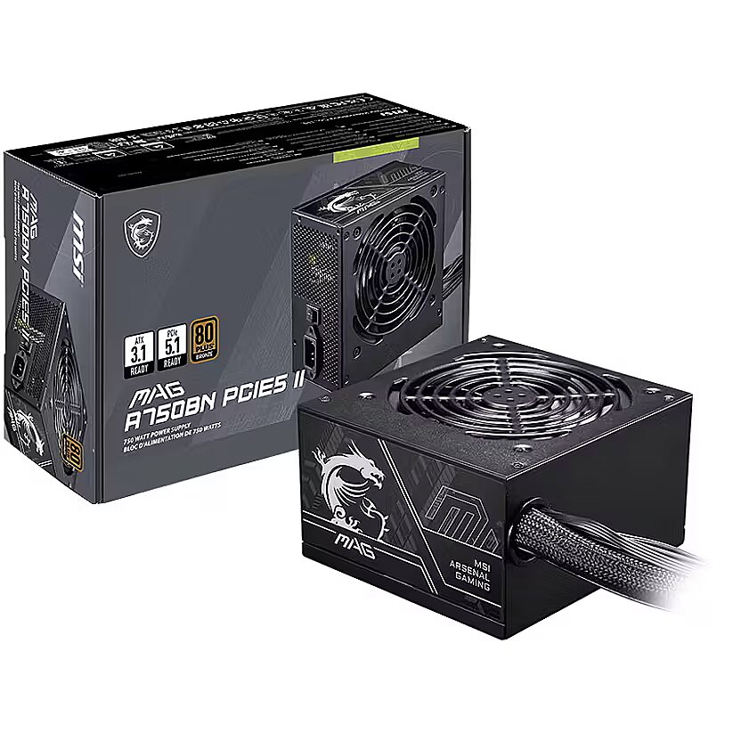 - Virtalähde (PSU): MSI MAG A750GL PCIE5, 80PLUS Gold, ATX 3.1, PCI 5.1