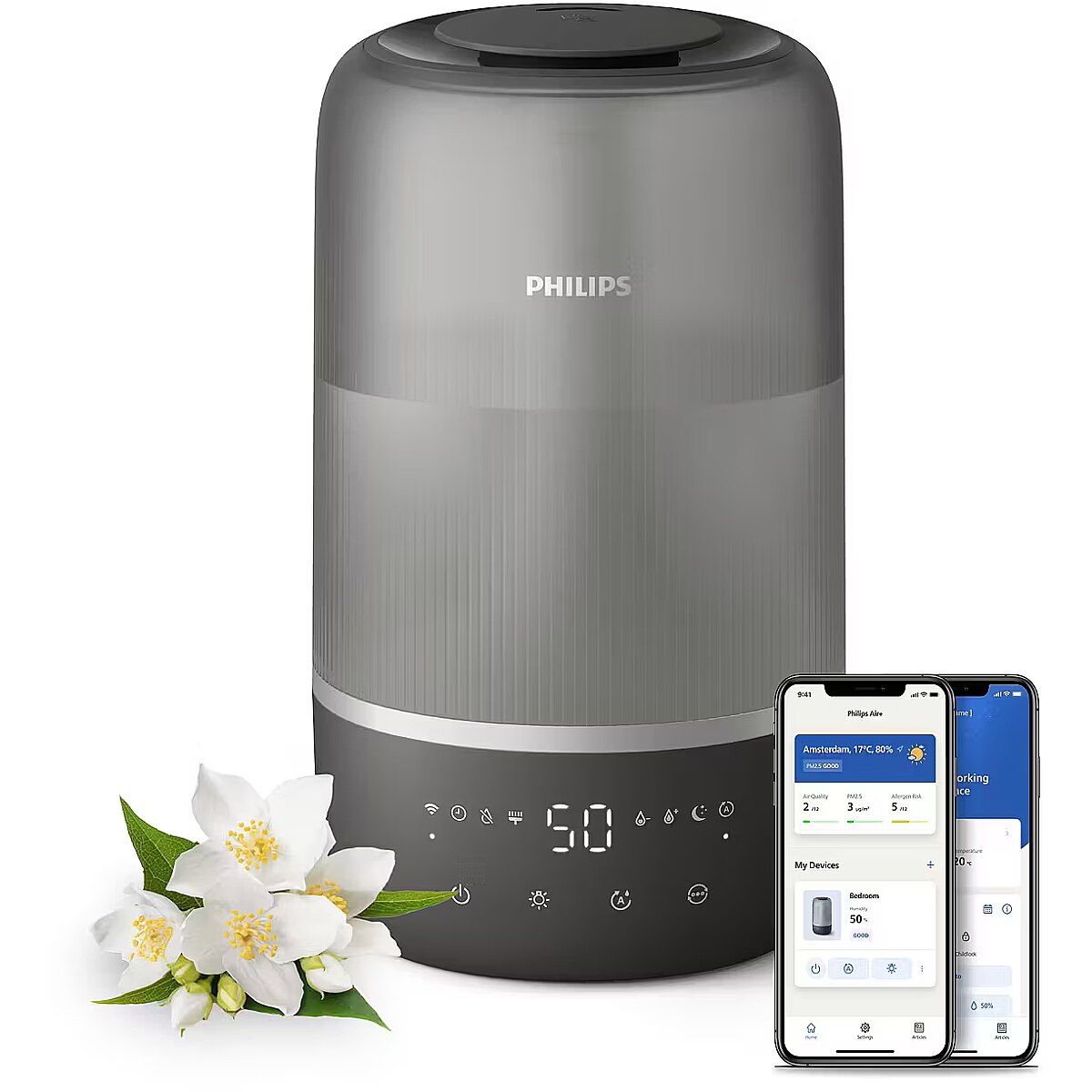 LietojamībaVada garums: 1,5 mRežīmi: Automātiskais režīms, miega režīmsĀtruma iestatījumi: Miega, vidējs, augstsMitruma iestatījumi: 40 %, 50 %, 60 %, 70 %Taimeris: 1–12 stunda(-as)Gaisa kvalitātes pārskats: Krāsu gredzens, skaitlisksSaskarne: Pieskāriens, ciparu, LEDBrīdinājums par tukšu ūdens tvertni: Jā