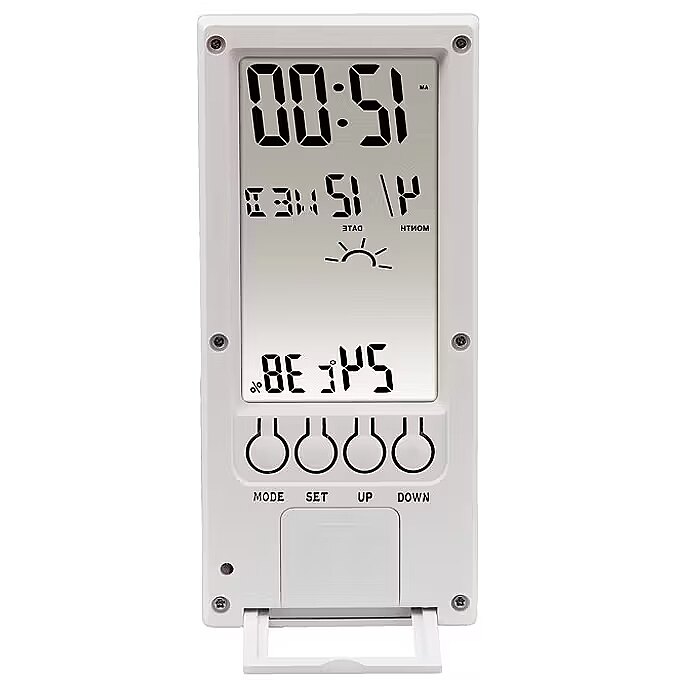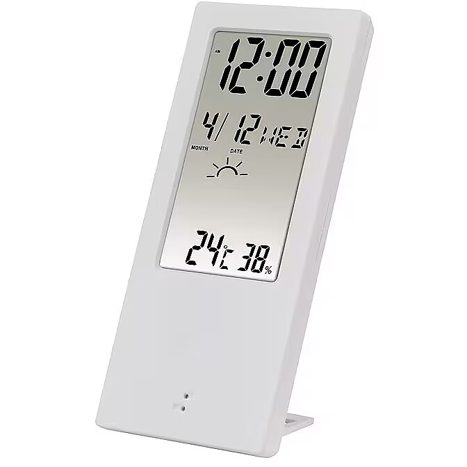 LongDesc - - Weather trend is displayed using three symbols: sunny, cloudy, rainy- Functions and measurement values are shown on a transparent display, for lightness on the deskDigital transparent display of temperature, air humidity, time and weather trendThermometer:- Can be switched between degrees Celsius and degrees Fahrenheit- Storage of the min./max. values for temperatureHygrometer:- Weather indicator: sunny, cloudy, rainy (based on the change in the ambient humidity values)- Storage of the min./max. ambient humidity valuesTime / calendar / alarm function:- Time can switched between the 12 and 24 h format- Date and weekday display- Alarm and snooze function- Extendable and fold-out base