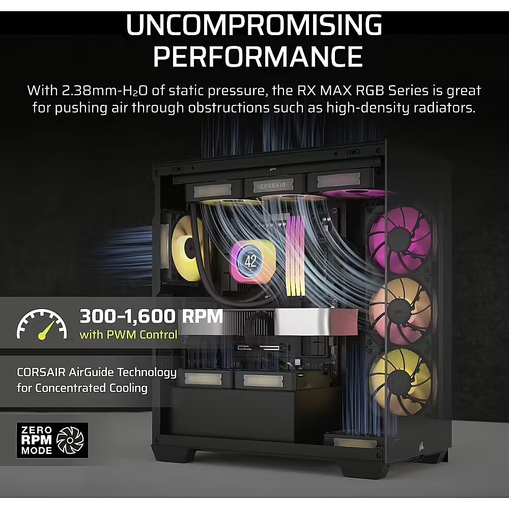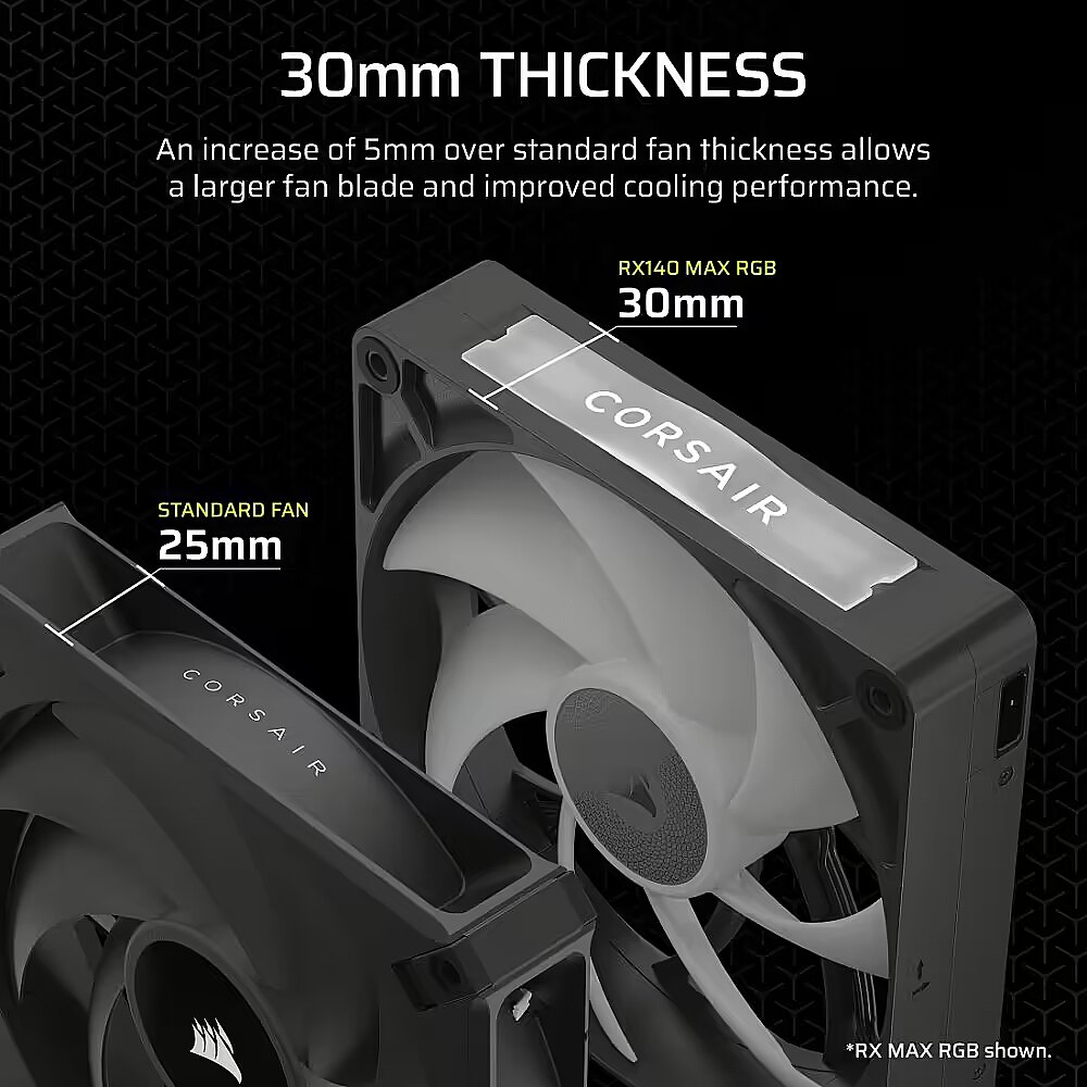 Wentylatory RX MAX RGB zostały stworzone przez specjalistów firmy CORSAIR, którzy maksymalnie wykorzystali wszystkie zalety ich grubszej obudowy. Przepływ powietrza