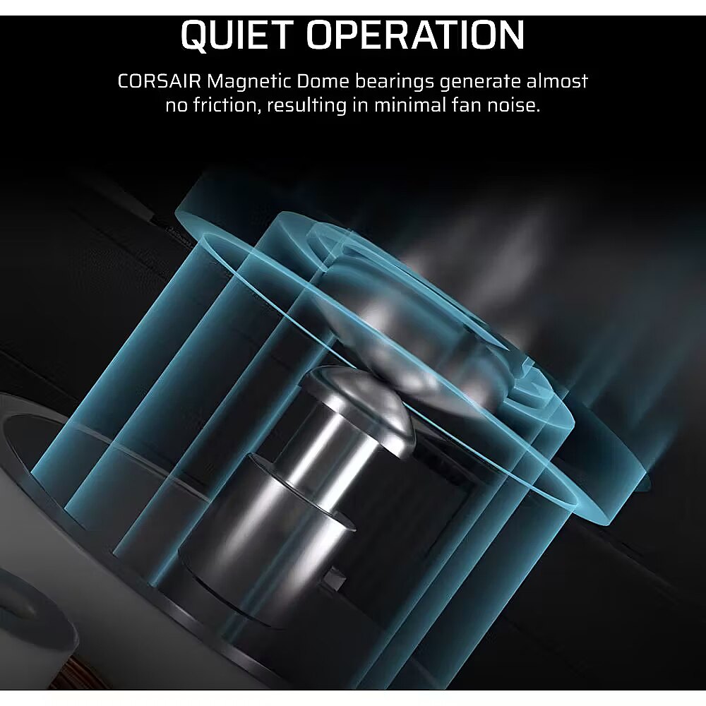 Wentylatory RX MAX RGB charakteryzują się znacznie mniejszym hałasem, ponieważ pracują przy niższej liczbie obrotów na minutę w porównaniu do tradycyjnych wentylatorów, zapewniając jednocześnie taki sam przepływ powietrza. Łożysko z magnetyczną kopułą