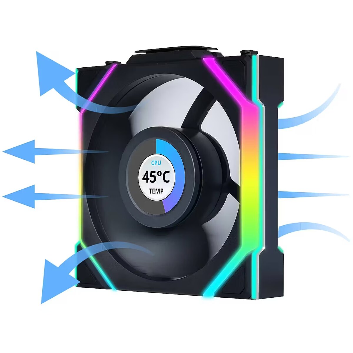 The UNI FAN SL Wireless series not only shows innovation in functionality but also enhances its visual appeal. Each side of the fan now features an additional light strip, increasing the total number of LEDs to 40. This enables duo-zoned lighting adjustments, delivering a more dynamic and versatile visual experience that truly stands out. PRACTICAL AND STYLISH LCD SCREEN