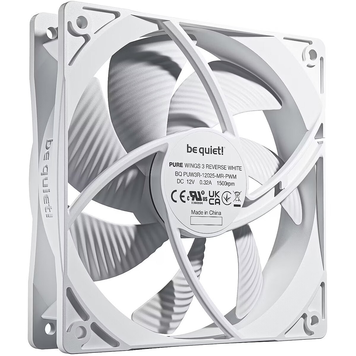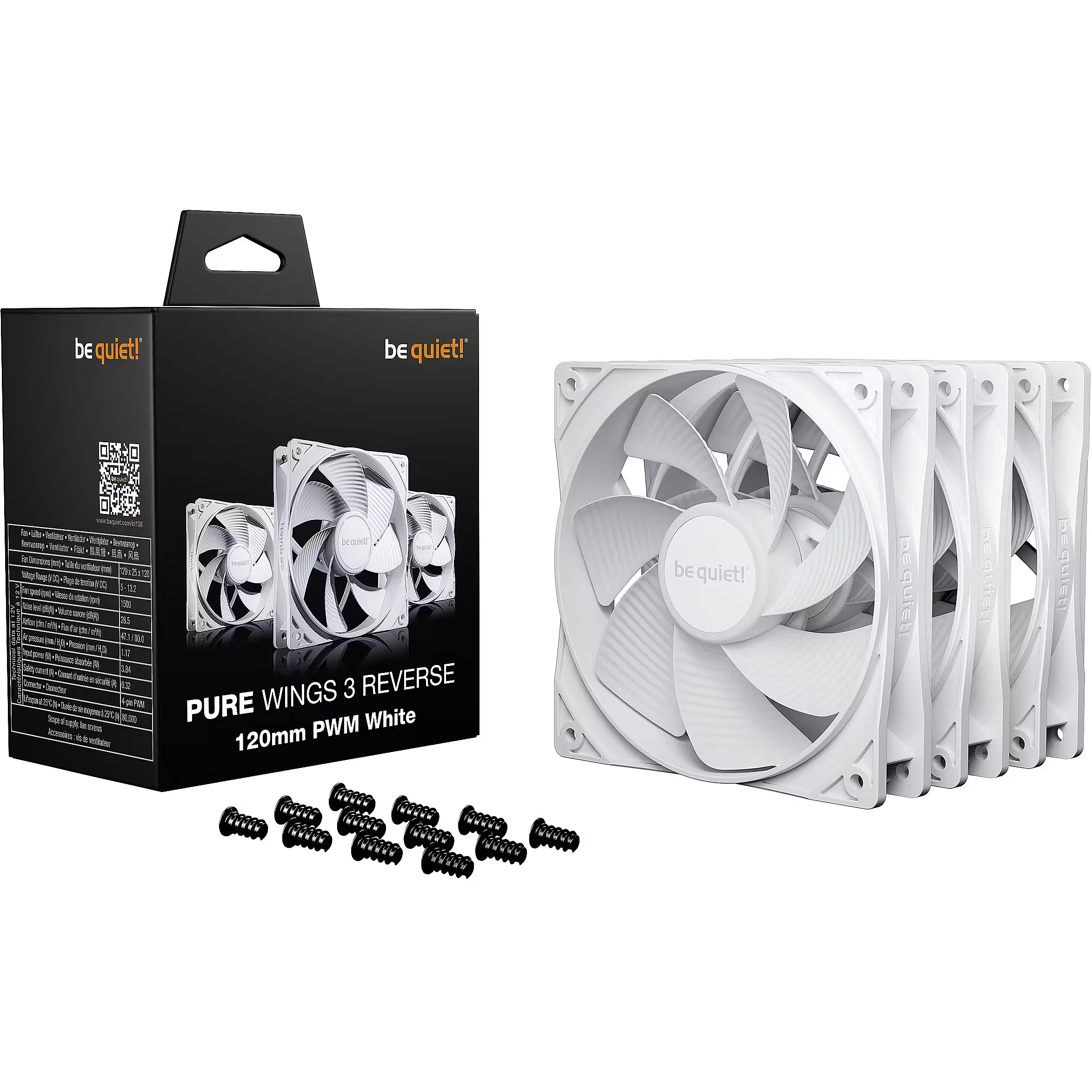 LongSummaryDescription - be quiet! Pure Wings 3 120 mm PWM Reverse Triple Pack White. Type: Fan, Fan diameter: 12 cm, Rotational speed (max): 1500 RPM, Airflow: 80 m³/h, Maximum air pressure: 1.17 mmH2O, Bearing type: Rifle bearing. Voltage: 5 - 13.2 V. Product colour: White