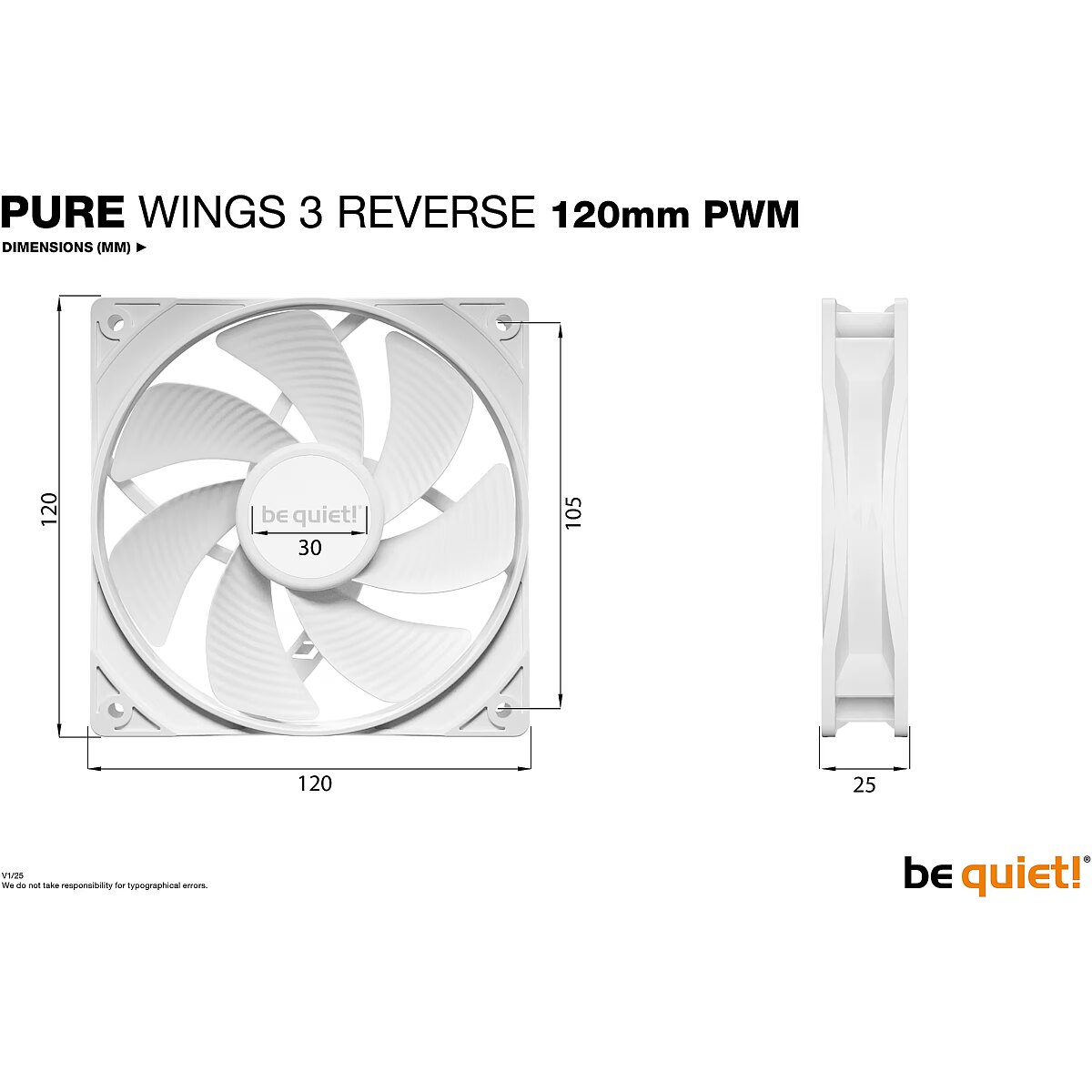 LongDesc - PURE WINGS 3120mm PWM Reverse White 3-PackPerformant, Progressive, QuietWith low minimum rpm and reversed fan blades, the Pure Wings 3 120mm PWM Reverse White Triple Pack is the perfect choice for side or bottom air intakes. The fan offers outstanding reliability and makes for a long-lasting, companion for your gaming system. REVERSED FAN BLADESFan blades optimized for high airflowWith optimization for maximum airflow, Pure Wings 3 120mm PWM Reverse White Triple Pack is the right choice for any case configuration that demands high cooling performance. Its 7 airflow-optimized fan blades not only reduce noise-generating turbulences but also ensure Pure Wings 3 120mm PWM Reverse White Triple Pack provides the performance that is needed, even in demanding configurations.PERFECT CASE FANPerfect choice as a side or bottom intakePure Wings 3 120mm PWM Reverse White Triple Pack is perfect as intake fan for spaces that are in the center of attention, for example as  a side or bottom air intake of a fishtank-style PC case. With its reversed  fan blades, you always keep the front  of these sleek fans in your view.ICONIC DESIGNStreamlined look makes it an instant timeless classicPure Wings 3 120mm PWM Reverse White Triple Pack trims all the fat. Every part and single detail contribute to the functionality and uncompromising performance. This has also been considered in the design of the fan. All outlines and angles serve a purpose, making Pure Wings 3 120mm PWM Reverse White Triple Pack a timeless classic and elegant addition to every gaming PC, especially in show cases like the Light Base series as a side or bottom intake . RIFLE BEARING TECHNOLOGYMakes Pure Wings 3 120mm PWM Reverse White Triple Pack a long-lasting companionPure Wings 3 120mm PWM Reverse White Triple Pack is built to last. With the proven rifle bearing technology, on average, this fan offers a lifespan of 80,000 hours.