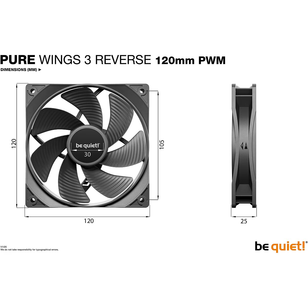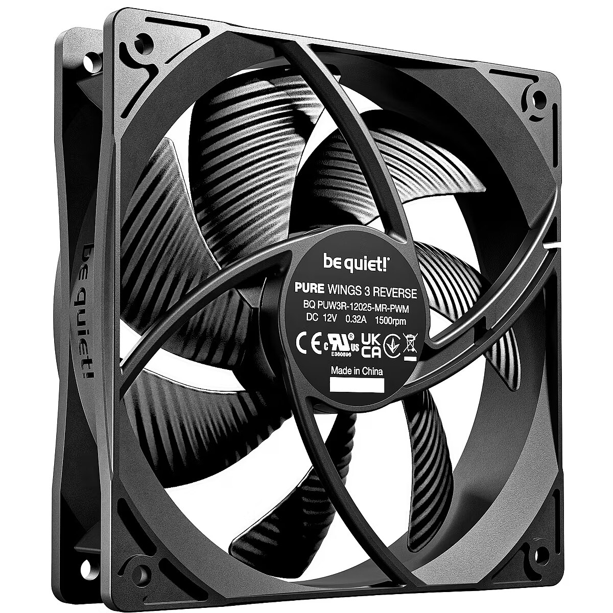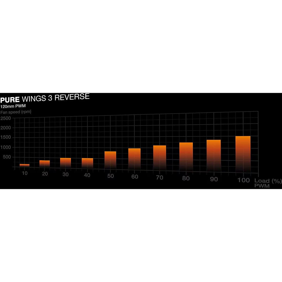 LongDesc - PURE WINGS 3120mm PWM Reverse 3-PackPerformant, Progressive, QuietWith low minimum rpm and reversed fan blades, the Pure Wings 3 120mm PWM Reverse Triple Pack is the perfect choice for side or bottom air intakes. The fan offers outstanding reliability and makes for a long-lasting, companion for your gaming system. REVERSED FAN BLADESFan blades optimized for high airflowWith optimization for maximum airflow, Pure Wings 3 120mm PWM Reverse Triple Pack is the right choice for any case configuration that demands high cooling performance. Its 7 airflow-optimized fan blades not only reduce noise-generating turbulences but also ensure Pure Wings 3 120mm PWM Reverse Triple Pack provides the performance that is needed, even in demanding configurations.PERFECT CASE FANPerfect choice as a side or bottom intakePure Wings 3 120mm PWM Reverse Triple Pack is perfect as intake fan for spaces that are in the center of attention, for example as a side or bottom air intake of a fishtank-style PC case. With its reversed fan blades, you always keep the front of these sleek fans in your view.ICONIC DESIGNStreamlined look makes it an instant timeless classicPure Wings 3 120mm PWM Reverse Triple Pack trims all the fat. Every part and single detail contribute to the functionality and uncompromising performance. This has also been considered in the design of the fan. All outlines and angles serve a purpose, making Pure Wings 3 120mm PWM Reverse Triple Pack a timeless classic and elegant addition to every gaming PC, especially in show cases like the Light Base series as a side or bottom intake . RIFLE BEARING TECHNOLOGYMakes Pure Wings 3 120mm PWM Reverse Triple Pack a long-lasting companionPure Wings 3 120mm PWM Reverse Triple Pack is built to last. With the proven rifle bearing technology, on average, this fan offers a lifespan of 80,000 hours.