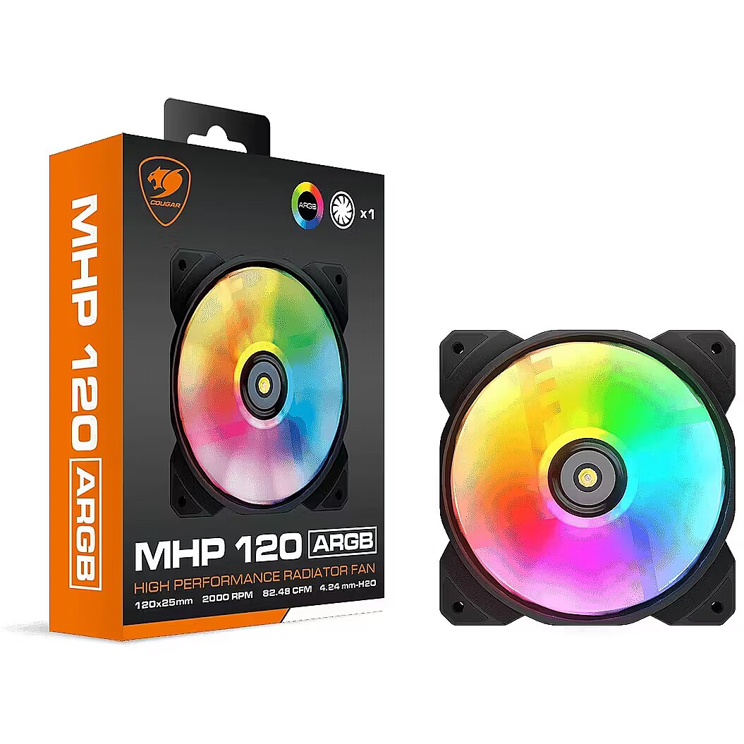 LongDesc - MHP 120- Single Pack -High-Performance Radiator ARGB FanThrough structural adjustment and precision tuning, MHP 120 ARGB fan is suitable for any cooling fan position inside the chassis. In addition, the metallic-reinforced motor hub & metallic bearing shell design drastically increases the stability and cooling performance. MHP 120 ARGB also provides various and colorful ARGB lighting effects for your chassis. It is the perfect choice for cooling fan upgrades!The Stunning ARGB Lighting EffectsWith the built-in 5V-ARGB ports and 9 ARGB lamp beads, COUGAR MHP 120 ARGB cooling fan provides various and colorful lighting effects through the fan blade that deliver a powerful and bright RGB lighting experience.Extremely Hyper FanWith 2000 RPM(max)Proven with data from certified professional testing labs, MHP 120 ARGB delivers 82.48 CFM/ 143.53 m3/h high airflow and 4.24mmH2O high static pressure. Moreover, it features a high fan speed capable of reaching up to 2000 RPM, providing outstanding performance, MHP 120 ARGB fan is the fan that dominates!Metal-reinforcedMotor Hub & ShellWith the metal-reinforced motor hub and metal bearing shell design, MHP 120 ARGB fan generates excellent rotational stability that takes enhanced performance and durability to a whole new level.HDB Bearing & PWM ControlMHP 120 ARGB is equipped with HDB bearing (Hydro Dynamic Bearings), which extends the fan’s life span and reduces decibel effectively. Meanwhile, PWM control technology allows for total control of fan speed to reach that perfect balance between machine performance and cooling.Anti-vibration DamperMHP 120 ARGB cooling fan is equipped with rubber dampers at four edges of the fan that absorbs vibration. Further reducing noise from mounting gaps and/or resonance in the chassis, adding to the quiet performance of your PC system.Suitable For Radiator / HeatsinkWith the high static pressure level of MHP 120 ARGB, it is an excellent choice for most radiators & heatsinks in maximizing their heat dissipation. And of course, MHP 120 ARGB is also compatible and can be mounted to most of the air/water coolers from other brands with ease.