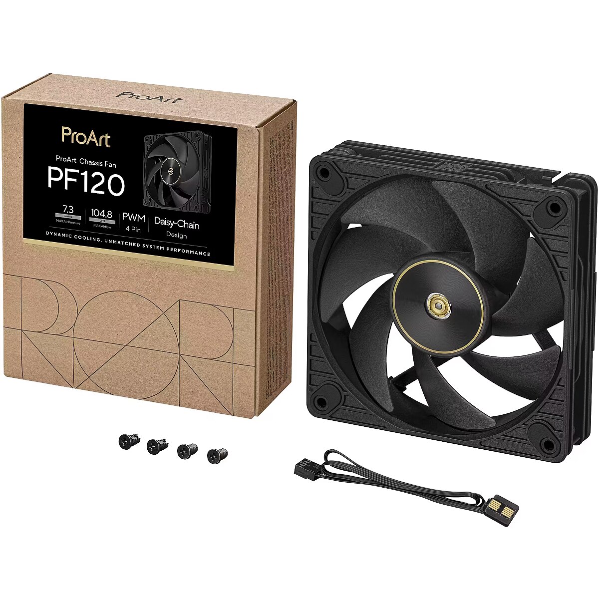 LongDesc - ProArt PF120 PWM FanThe Art of Performance CoolingThe ProArt PF120 fan delivers superior cooling with premium quality and design for unmatched reliability . Boasting a 28mm frame, powerful 3-phase and 6-pole motor, CNC-milled brass bearing housing, reinforced Liquid Crystal Polymer (LCP) blades, and patented daisy-chain connectors to streamline installation and cable management, the ProArt PF120 is the ideal choice for users who demand peak performance and effortless integration.