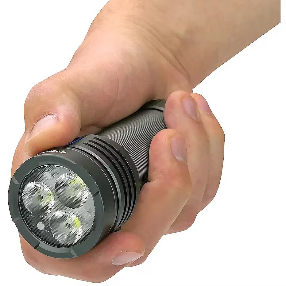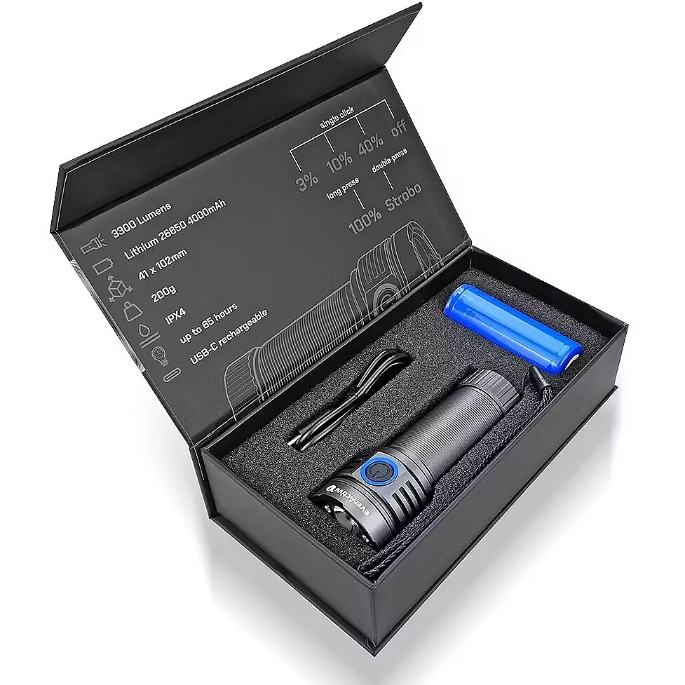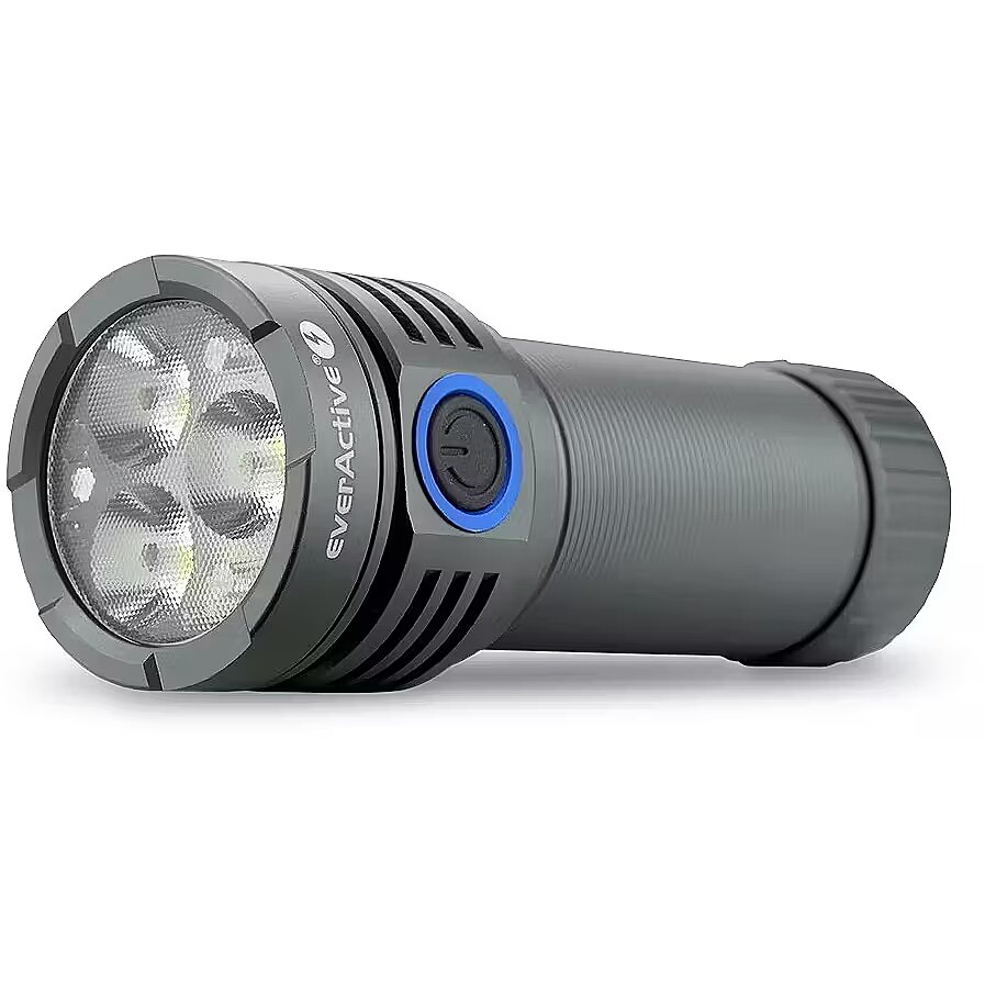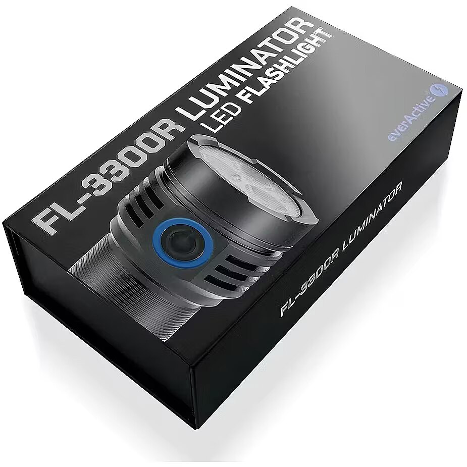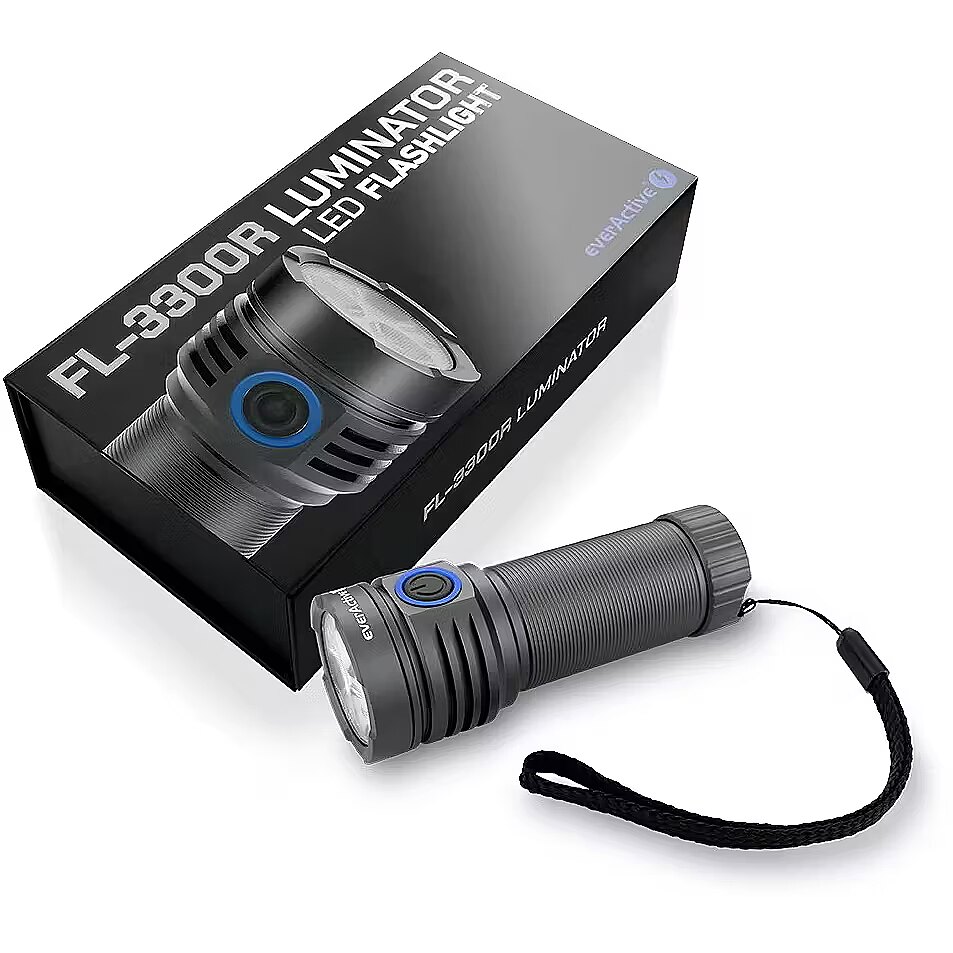 Description - The FL-3300R is a handy yet powerful handheld flashlight from the everActive brand. Its maximum light output of 3300 lumens provides excellent illumination even in complete darkness. The undeniable advantages of our flashlights include high-quality workmanship, versatility, and the use of the most modern solutions available on the market. The everActive FL-3300R flashlight is exceptionally comfortable to use handy and made of durable aluminum characterized by increased durability. Our flashlight is equipped with modern OSRAM P9 LEDs with a power output of up to 10W (each), making it exceptionally powerful for its size. Thanks to its high-quality components, the flashlight feels complete and is suitable for use at home, on a campsite, or during an evening walk in the forest. The device's housing is made of exceptionally durable aluminum and has an IPX4 rating. The device is powered by a high-capacity 4000mAh lithium-ion battery! The battery is replaceable and charges via the USB-C port integrated into the flashlight, with a charging time of approximately 7 hours. The set includes the flashlight, battery, lanyard, and user manual. Everything is beautifully packaged in an elegant gift box, perfect for a gift for a loved one.