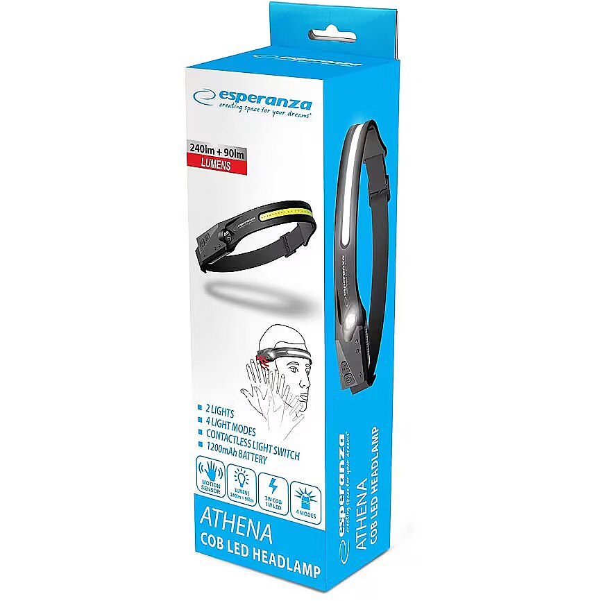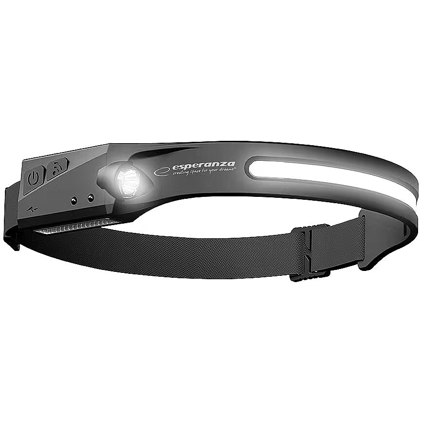 Description - Powerful Esperanza ATHENA LED headlamp equipped with two light sources switchable with a button: a COB diode in the form of a strip and an XPE flashlight. The COB diode illuminates the surroundings within an angle of 230o, which allows you to illuminate a large area without turning your head. The XPE reflector is perfect for precisely illuminating the work surface from a short distance. A flexible, width-adjustable rubber strap allows the flashlight to fit snugly on the head and prevents it from slipping. Additionally, the flashlight can be turned on using a motion sensor (hand gesture), which increases the convenience of using it and protects the flashlight against dirt during operation. Diode: COB LED Light output: 240 Lumens (COB) + 90 Lumens (LED) LED lifespan: 50,000 h Maximum distance: 100 m Modes: main light 100% / 50% side light 100% / 50% Built-in battery: Li-ion 120 mAh Flashlight power: 3 W COB + 1 W LED Main lighting angle: 230o Degree of protection: IPX2 Smart sensor: touchless light switch Housing: durable plastic Charging Port: USB C Working time: up to 6 hours Charging time: approx. 2.5 hours Dimensions: 29.0 x 2.0 x 3.2 [cm] Weight: 67 g The set includes a USB C charging cable (length approx. 50 cm)