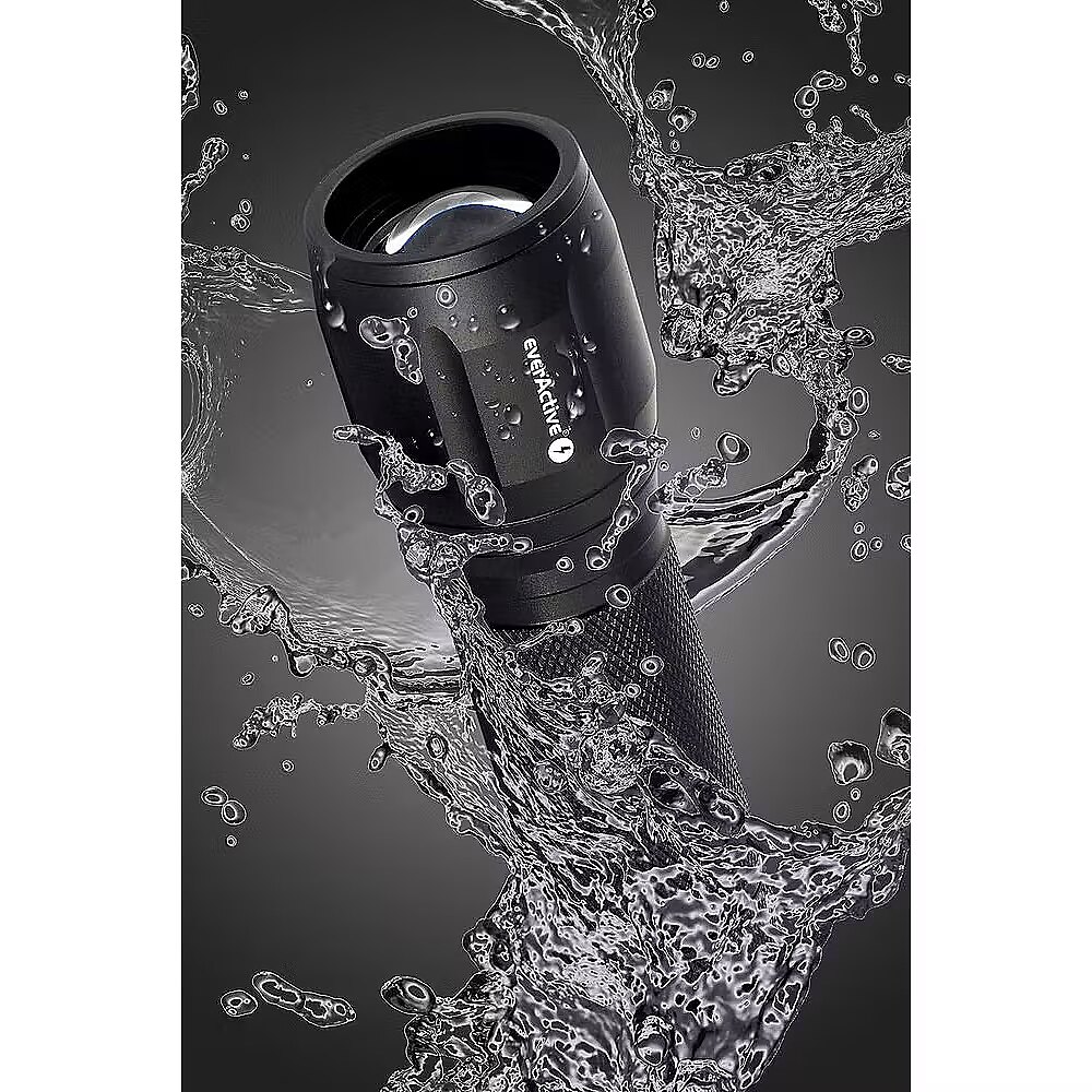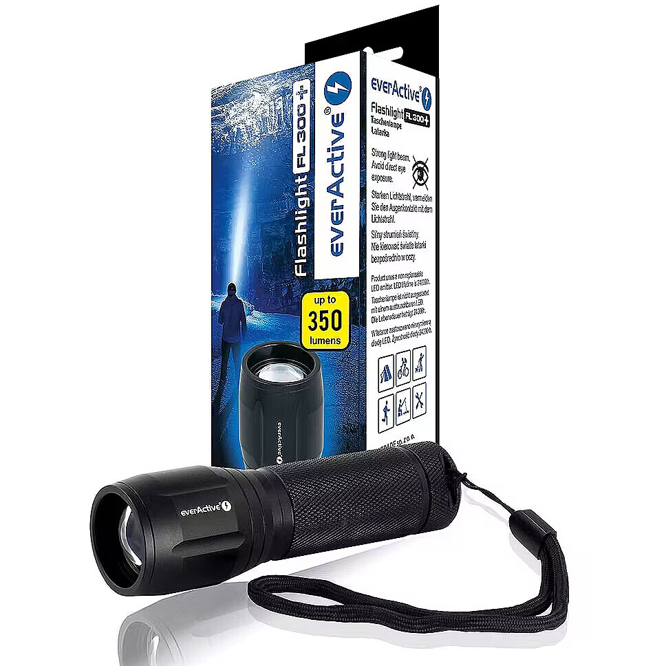 Description - LED flashlight everActive FL-300+ Original Cree XP-G3 LED, light output - 350 lumens! 550 lumens with the use of additional adapter and Li-ion battery Focus function - beam adjustment Waterproof Housing made of durable aluminum 3 lighting modes: 100%, 25%, strobe Power supply: 3x AAA/ R03 (not included)