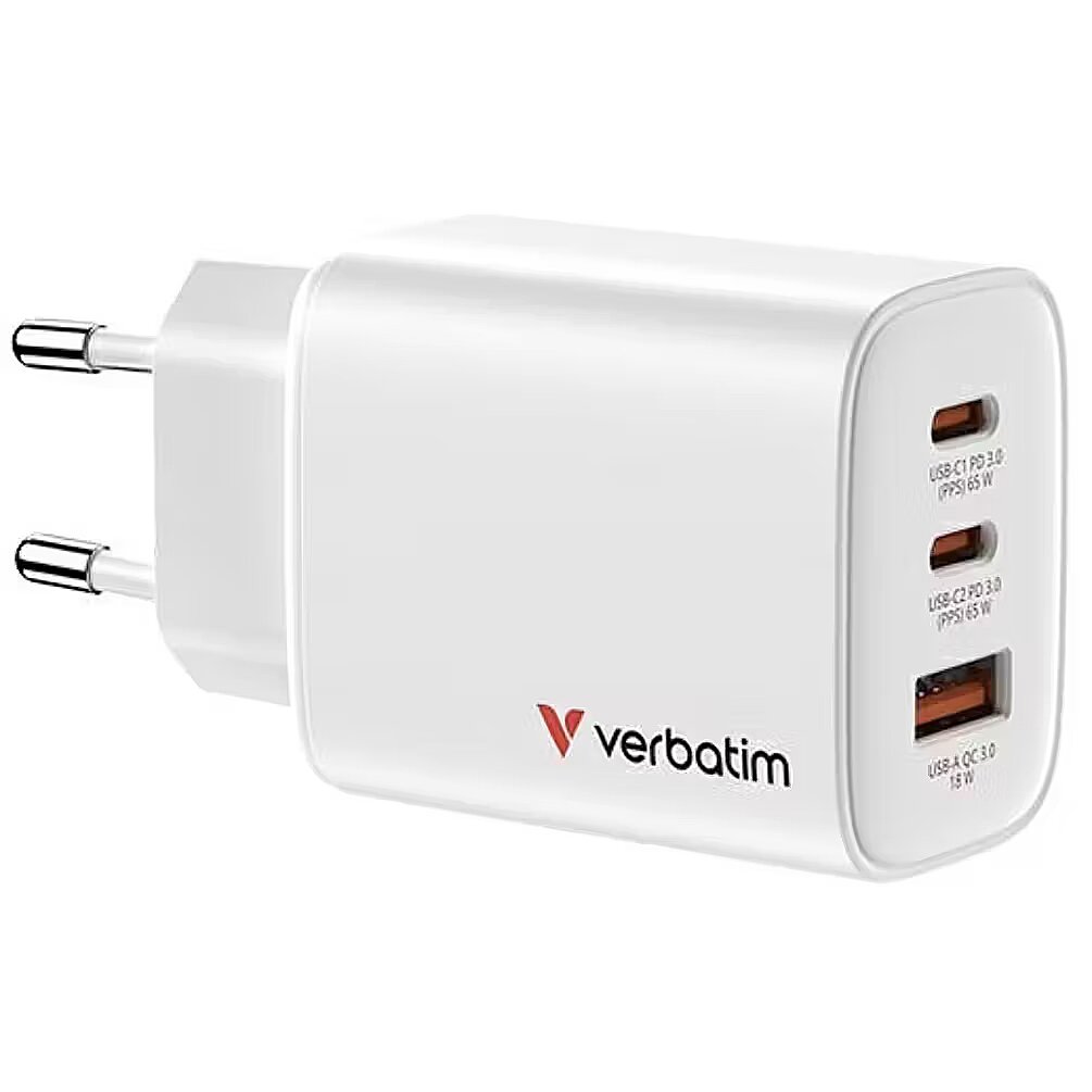 LongDesc - Compact, Powerful Charging with GaN EfficiencyCharge smarter and faster with the Verbatim Essentials 65W GaN Charger – the sleek, high-performance charging solution featuring GaN technology and support for simultaneous multi-device charging.Gallium Nitride (GaN) technology is transforming the way we charge. By replacing traditional silicon with GaN, this charger operates more efficiently, produces less heat, and allows for a significantly smaller footprint – all while maintaining high-power performance.One Charger for All Your DevicesWith two USB-C PD 3.0 ports and one USB-A QC 3.0 port, the Essentials 65W GaN Charger is a true multitasker. Whether you're powering a laptop, phone, tablet, or other USB-enabled device, this charger distributes power intelligently and safely, allowing you to charge three devices at the same time.It’s the perfect blend of portability and power, providing fast, reliable charging without the bulk of traditional chargers.Safe, Efficient, and Travel-ReadyYour devices are in safe hands. The Essentials GaN Charger includes four advanced protection systems to guard against over-current, over-voltage, short-circuits, and overheating. Its compact and lightweight design, combined with a wide voltage input range (100–240V), makes it an ideal travel companion – whether for business trips or daily commuting. No more juggling chargers – one compact device does it all.