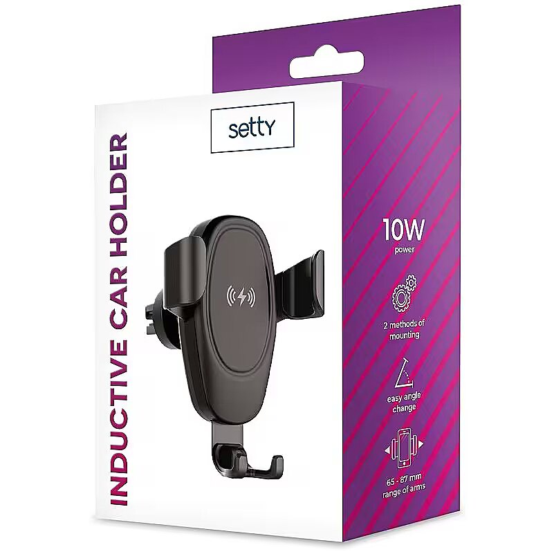 description_en - Gravity car holder with induction charging function allows convenient positioning of the device within sight and hands of the driver. The 360 ??degree rotation and easy change of the angle of the handle guarantee the convenience of using the devices while traveling. Thanks to the induction charging function your phone will be charged when placed in the holder. Includes 2 tips for mounting the handle: terminal for mounting on a ventilation grille and terminal for mounting on a dashboard.