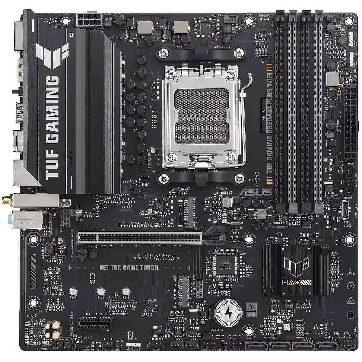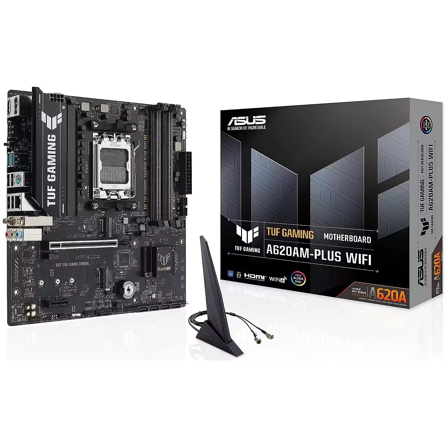 LongSummaryDescription - ASUS TUF GAMING A620AM-PLUS WIFI. Processor manufacturer: AMD, Processor socket: Socket AM5, Compatible processor series: AMD Ryzen 7000 Series, AMD Ryzen 8000 Series, AMD Ryzen 9000 Series. Supported memory types: DDR5-SDRAM, Maximum internal memory: 256 GB, Memory slots type: DIMM. Supported storage drive interfaces: M.2, SATA III, Supported storage drive types: HDD & SSD, RAID levels: 0, 1, 5, 10. Ethernet interface type: 2.5 Gigabit Ethernet, Top Wi-Fi standard: Wi-Fi 6 (802.11ax), Wi-Fi standards: Wi-Fi 6 (802.11ax). Component for: PC, Motherboard form factor: micro ATX, Motherboard chipset family: AMD