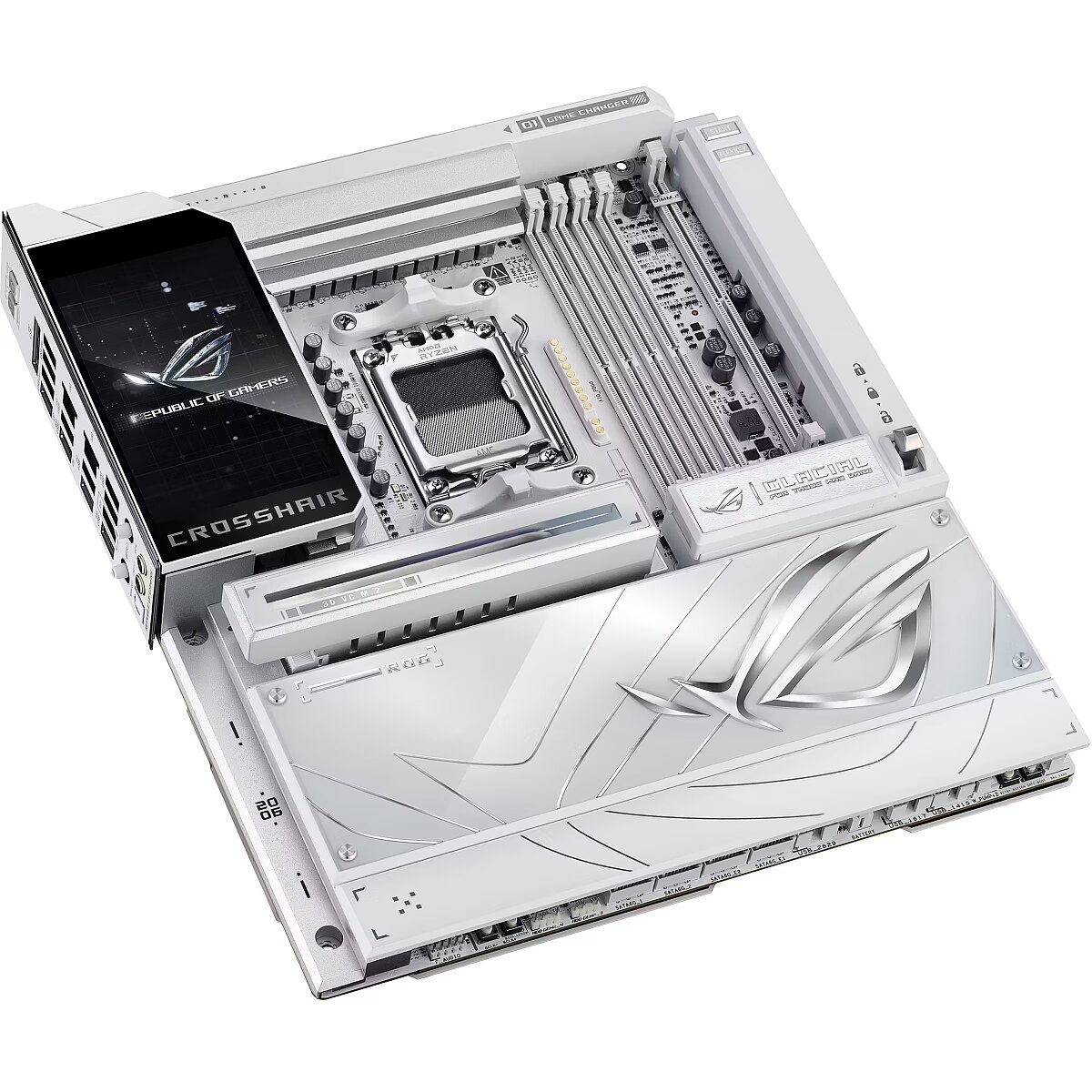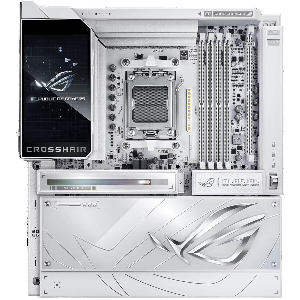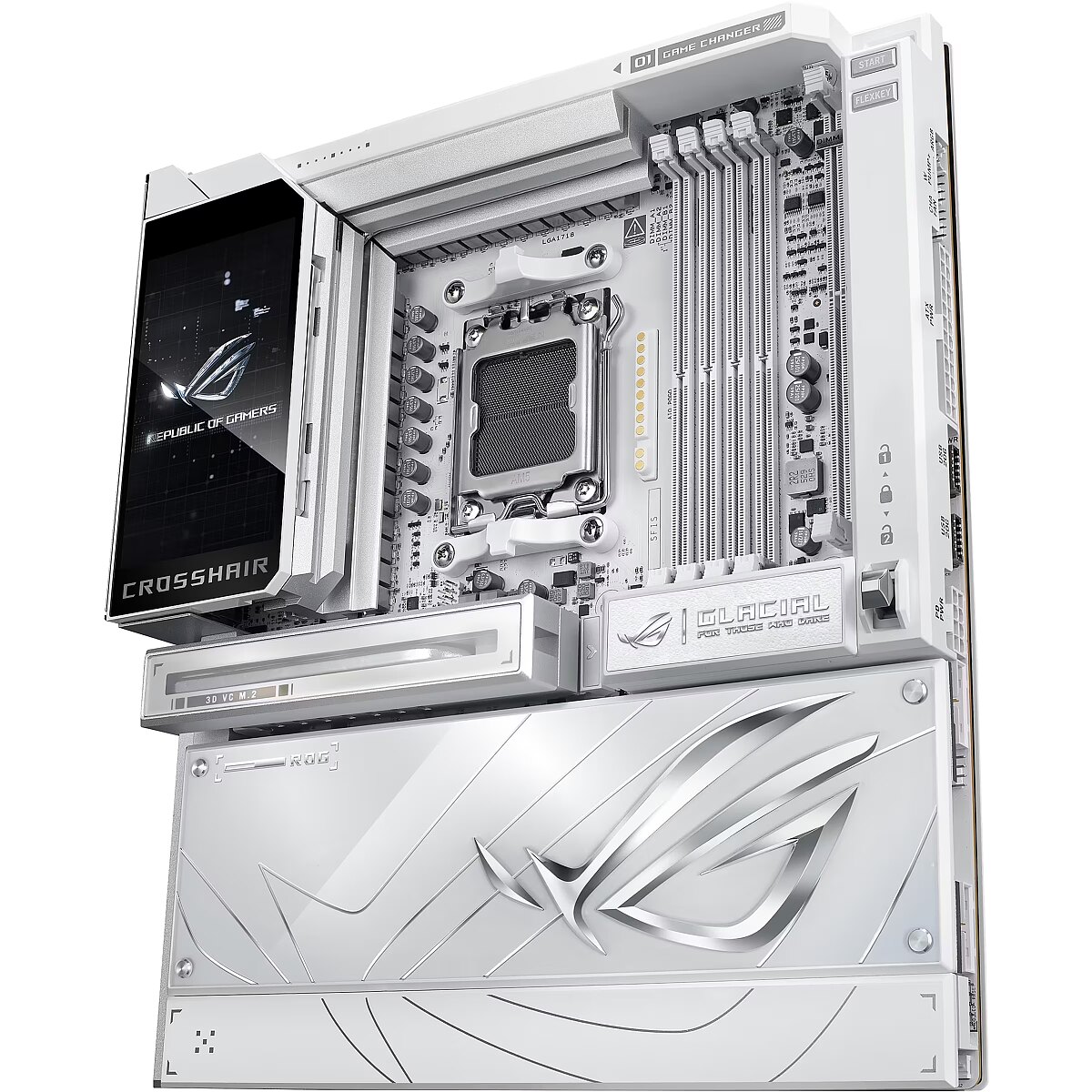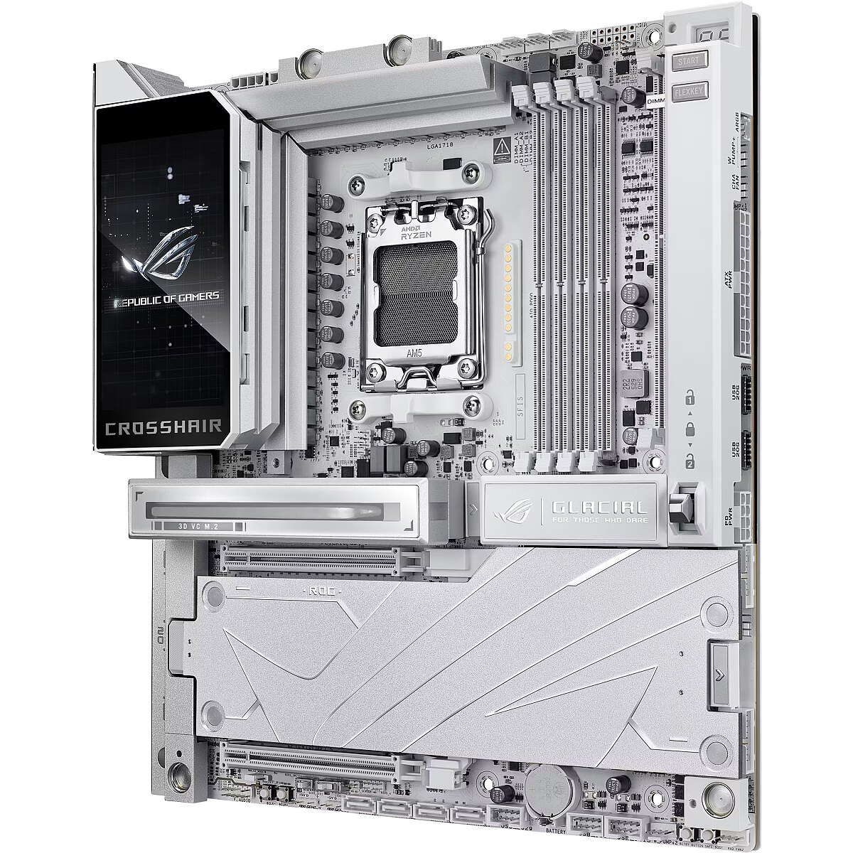 LongDesc - The ROG X870E Glacial is a flagship motherboard engineered for uncompromising performance and sophisticated AI. It boasts a robust 24+2+2 power stage design, Dynamic OC Switcher, and Core Flex for next-generation overclocking control. Meanwhile, advanced memory tuning is unlocked through server-grade DRAM enhancement and NitroPath DRAM technology, and storage scales with support for up to seven M.2 drives. Top-tier connectivity includes two 10G Ethernet ports, two USB4® ports, and two USB 20Gbps Type-C® front-panel connectors. This motherboard also features a 3D VC M.2 heatsink and a 5-inch LCD display, along with AI Cache Boost and AI Advisor for smarter, more intuitive system tuning.