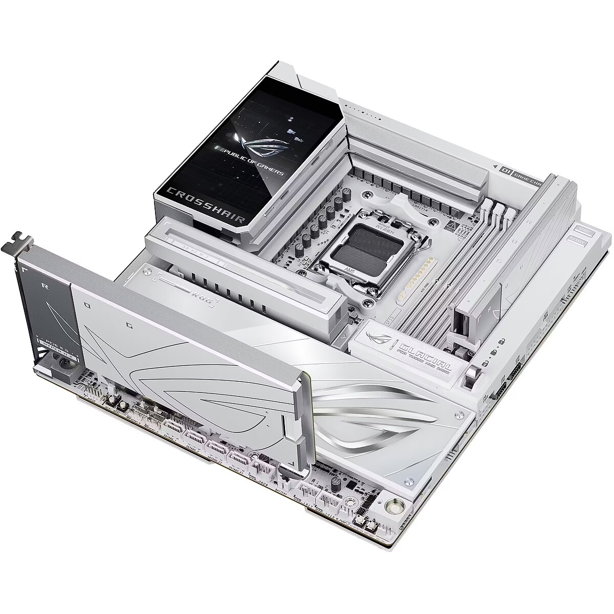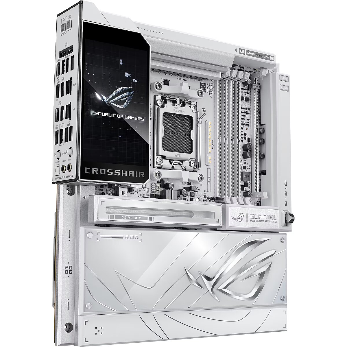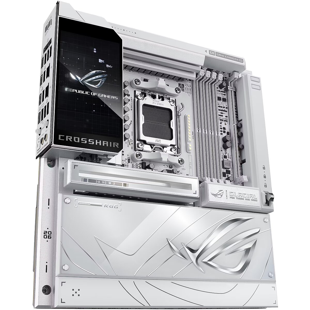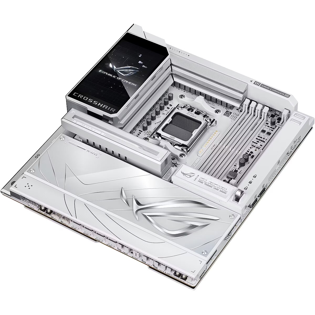 LongDesc - The ROG X870E Glacial is a flagship motherboard engineered for uncompromising performance and sophisticated AI. It boasts a robust 24+2+2 power stage design, Dynamic OC Switcher, and Core Flex for next-generation overclocking control. Meanwhile, advanced memory tuning is unlocked through server-grade DRAM enhancement and NitroPath DRAM technology, and storage scales with support for up to seven M.2 drives. Top-tier connectivity includes two 10G Ethernet ports, two USB4® ports, and two USB 20Gbps Type-C® front-panel connectors. This motherboard also features a 3D VC M.2 heatsink and a 5-inch LCD display, along with AI Cache Boost and AI Advisor for smarter, more intuitive system tuning.