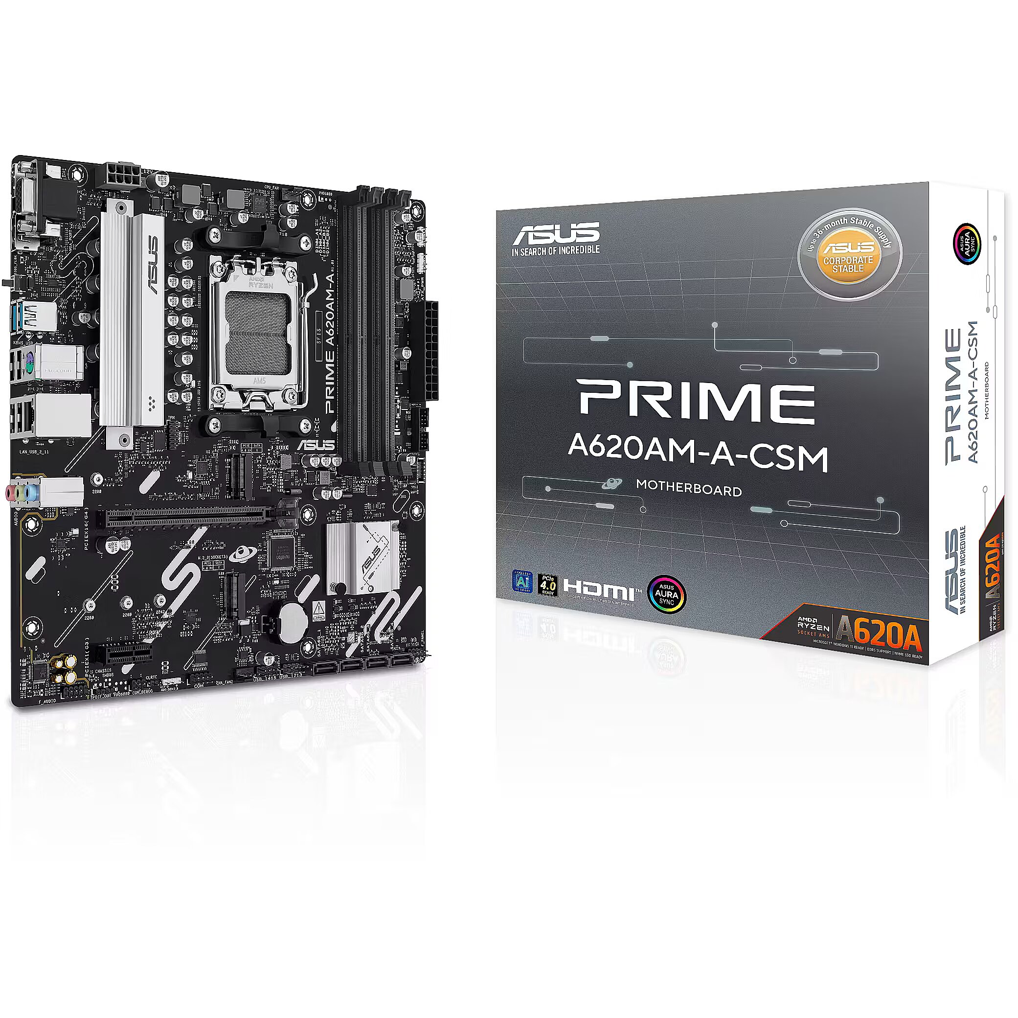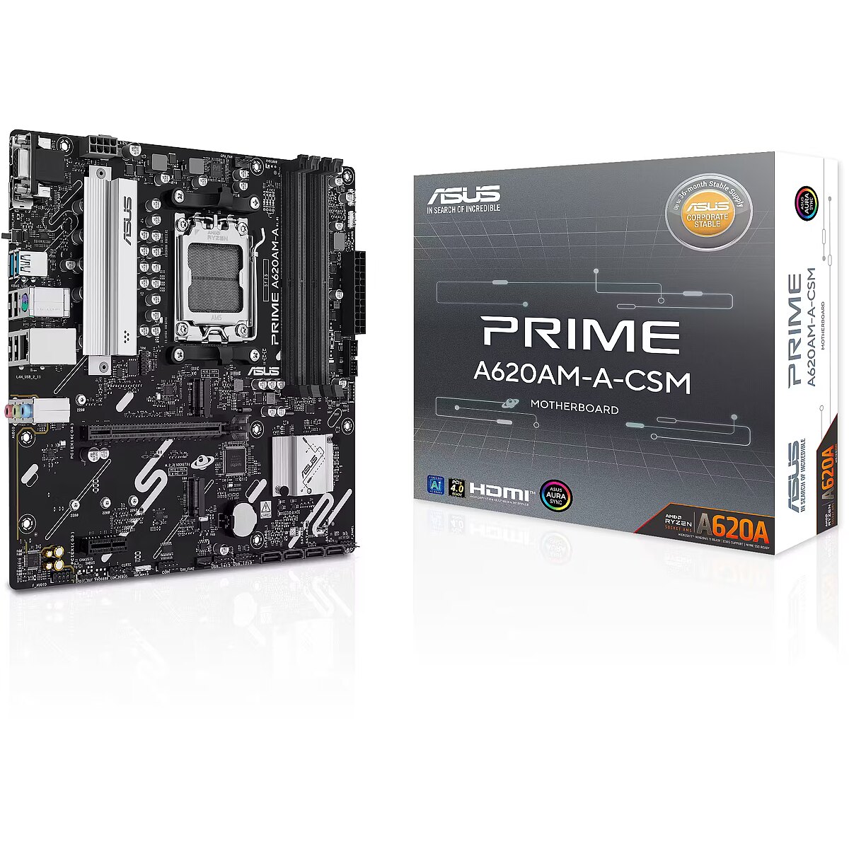LongDesc - A620AM-A-CSMASUS Prime series motherboards are expertly engineered to unleash the full potential of AMD Ryzen™ 9000 series processors. The PRIME A620AM-A-CSM motherboard provides users and PC DIY builders with a range of performance optimizations via intuitive software and firmware features. It’s designed to be Advanced AI PC-ready, offering the power and connectivity needed for demanding AI applications.