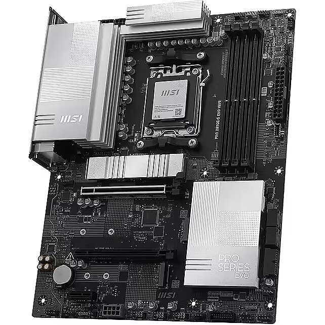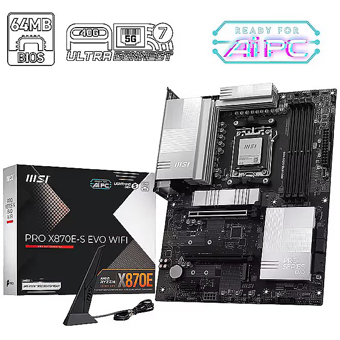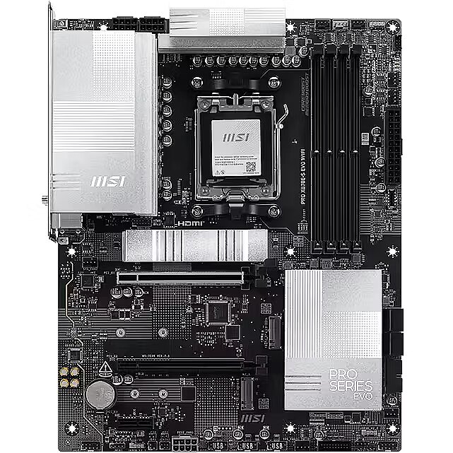 LongDesc - PRO X870E-S EVO WIFI offers a simple design with a harmonious silver color scheme that perfectly matches both white and black PC builds. It is engineered with many exclusive features of MSI, a Wi-Fi 7 with EZ Antenna, 5G LAN, PCIe 5.0 M.2 with EZ M.2 Shield Frozr II, and Supplemental PCIe Power, ready for the AMD Ryzen™ 9000 series processors.The PRO Series is tailored to professionals from all walks of life. The lineup features impressive performance and high quality, while aiming to provide users incredible experience. Users who care about productivity and efficiency can definitely count on the MSI PRO Series to assist you with multitasking and increasing efficiency.MSI motherboards are designed with advanced hardware and technology, well-supporting the demanding computing usage of gaming and AI. Moreover, we also introduce AI to MSI Center and BIOS, making everything more effortless than before.Unleash and sustain the maximum performance with a flagship VRM design built with a total of 12+2+1 digital power phases. Combining dual power connectors and 60A Smart Power Stage, PRO X870E-S EVO WIFI is ready for the challenge of high-end processors.BUILD FOR THE MOST ADVANCED PC FOR GAMING AND CREATINGWhen only the fastest will do, an AMD X800-series motherboard delivers. With USB 4.0 onboard along with robust overclocking1 capabilities, featuring faster dual-channel DDR5 memory support, AMD EXPO™ technology and PCIe® 5.0 support for both graphics and NVMe, you can play the most demanding games and deliver your biggest projects with the revolutionary performance of an AMD X800-series motherboard and AMD Ryzen™ 9000, 8000, and 7000 Series processors.