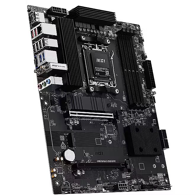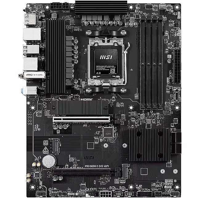 LongDesc - PRO B850-S EVO WIFIPRO B850-S EVO WIFI offers a simple design with a harmonious black color scheme that perfectly matches black PC builds. It is engineered with many exclusive features of MSI, a Wi-Fi 7 with EZ Antenna, 5G LAN, PCIe 5.0 M.2 with M.2 Shield Frozr, EZ PCIe Clip II, and Supplemental PCIe Power, ready for the AMD Ryzen™ 9000 series processorsThe PRO Series is tailored to professionals from all walks of life. The lineup features impressive performance and high quality, while aiming to provide users incredible experience. Users who care about productivity and efficiency can definitely count on the MSI PRO Series to assist you with multitasking and increasing efficiency.MSI motherboards are designed with advanced hardware and technology, well-supporting the demanding computing usage of gaming and AI. Moreover, we also introduce AI to MSI Center and BIOS, making everything more effortless than before.The new EZ PCIe Clip II, located on the first slot, features the rebounding force mechanism that allows for easy removal of the graphics card by pressing the tail-like lock with one finger. Due to this exquisite design, users can uninstall the graphics cards effortlessly, even in the cramped case spaces.MSI motherboards circuitry ensure the case standoff keep out zones are pure and clean. Moreover, the protective paint is printed around each screw hole to prevent parts from being scratched or damaged to the motherboard.MSI EZ Antenna makes the process effortless by simply attaching fasteners to the motherboard without rotation.EZ DEBUG LEDOnboard LEDs will indicate the source of the problem so you know exactly where to look to get up and running again.EZ Memory Detection LEDThis LED lights up when it detects faulty memory in slots, eliminating guesswork from troubleshooting.While overclocking can be overly complex for some, MSI Click BIOS X made it more accessible with multiple one-click overclock features for both processor and memory, allowing users to easily enhance system performance without delving into intricate settings.A host of features inject artificial intelligence into key aspects of your computing experience to make smarter, real-time optimizations. The MSI Center offers a clean, minimal interface to customize and manage your PC settings. The AI Engine, for example, automatically adjusts settings based on the applications you're using, ensuring seamless performance.Unleash and sustain the maximum performance with a flagship VRM design built with a total of 12+2+1 digital power phases. With 8+4 power connectors, PRO B850-S EVO WIFI is ready for the challenge of high-end processors.MSI utilizes PCB Fabric Technology to enhance signal performance, resulting in higher bandwidth and faster data transfer while minimizing signal loss. The PCB Fabric Technology also offers better impedance control and improved thermal stability, allowing the boards to endure demanding conditions. Due to the high-quality materials used, MSI motherboards are highly reliable and well-suited for the requirements of modern technology.With the rich features of MSI BIOS, you can easily enjoy the powerful performance that overclocking brings.A huge step of DDR performance enhancement with the latest DDR5 memory. Combines with dedicated SMT welding process and MSI Memory Boost technology, PRO B850-S EVO WIFI is ready to deliver the world class memory performance.The High-Efficiency Mode is designed to optimize memory performance byincreasing memory bandwidth and reducing latency. With the four sets of RAM timing settings, it allows users to find out the optimal configuration based on the quality of their memory modules.MSI BIOS has introduced the latest Latency Killer feature on all AM5 socket motherboards. Users can enable Latency Killer in the BIOS to reduce memory latency by up to 12% when running at high frequencies. Importantly, it is compatible with a wide range of memory overclocking features, including Memory Try It!!, EXPO, A-XMP, and High-Efficiency Mode, etc.Transient Voltage Suppressors (TVS) are safety devices used to protect against excessive voltage. All motherboard models of MSI are equipped with TVS. When the voltage abnormally rises, the TVS switches from a high-resistance state to a low-resistance state, diverting the excessive voltage to ground. This helps prevent circuit damage caused by high voltage.The 4-pin, 8-pin, and 24-pin power connectors of MSI motherboards are all designed with solid pins. The solid pin design allows for a more stable transmission of 12V power to the CPU, even when handling high current loads.Corrosive resistance IO Shield to help improve static electricity and reduce electromagnetic radiation noise from the system as well as more durable compare to traditional IO Shields.MSI motherboards prioritize safety with the embedded Overcurrent Protection (OCP), ensuring crucial components such as the USB ports, DDR memory, PWM IC, and CPU are shielded from excessive current. This proactive defense mechanism curtails the risk of damage or malfunction due to power surges, promoting long-term system stability. This commitment to safeguarding your hardware underscores MSI's dedication to producing motherboards that prioritize durability and stability.The grounding structure of power phases is the MSI's exclusive design. This patented design enables to suppress the electromagnetic interference (EMI) generated by the power phases and helps to efficiently conduct heat to the copper plane with grounding properties.Heavy Plated VRM HeatsinkThe VRM heatsink covers the upper MOS and helps dissipate the heat.M.2 Shield FrozrStrengthened M.2 thermal solution helps keep M.2 SSD safe and ensures incredible performance.7W/mK Thermal Pad & Additional Choke PadHigh-quality 7W/mK MOSFET thermal pads and additional choke thermal pads ensure stable performance when all cores are running at high speed.Chipset HeatsinkThe heatsink is designed to reduce dust and noise and cap