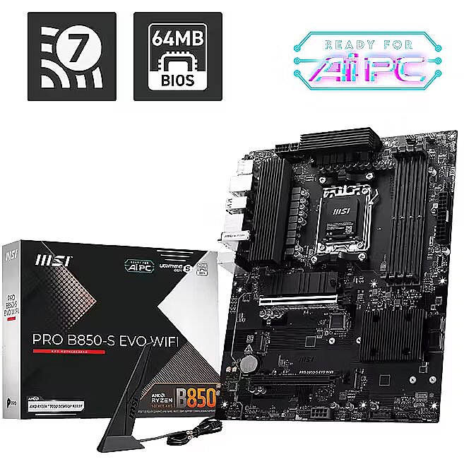 LongSummaryDescription - MSI PRO B850-S EVO WIFI. Processor manufacturer: AMD, Processor socket: Socket AM5, Compatible processor series: AMD Ryzen 7000 Series, AMD Ryzen 8000 Series, AMD Ryzen 9000 Series. Supported memory types: DDR5-SDRAM, Maximum internal memory: 256 GB, Memory slots type: DIMM. Supported storage drive interfaces: M.2, SATA, Supported storage drive types: HDD & SSD, RAID levels: 0, 1, 10. Ethernet interface type: 2.5 Gigabit Ethernet, Top Wi-Fi standard: Wi-Fi 7 (802.11be), Wi-Fi standards: Wi-Fi 7 (802.11be). Component for: PC, Motherboard form factor: ATX, Motherboard chipset family: AMD