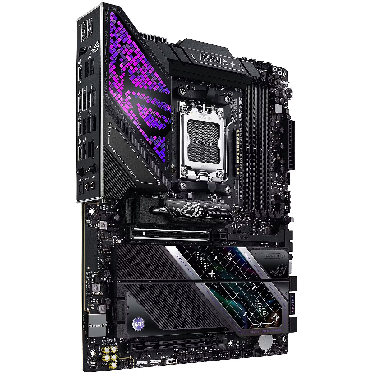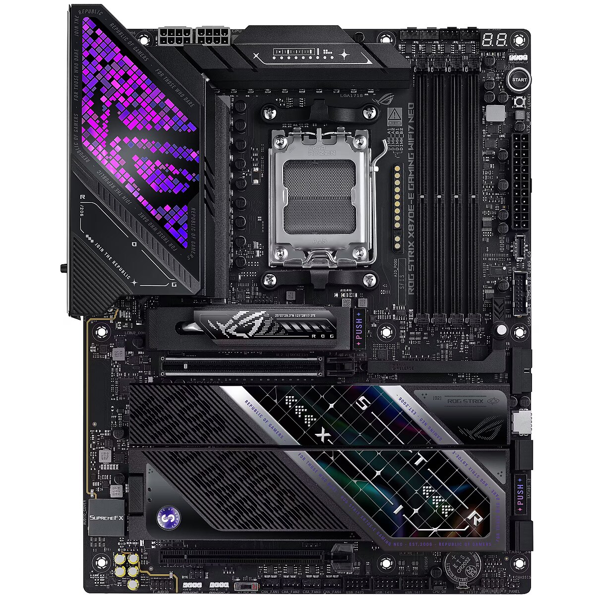 ShortSummaryDescription - ASUS ROG STRIX X870E-E GAMING WIFI7 NEO, AMD, Socket AM5, AMD Ryzen 9000 Series, AMD Ryzen 8000 Series, AMD Ryzen 7000 Series, DDR5-SDRAM, 256 GB, DIMM