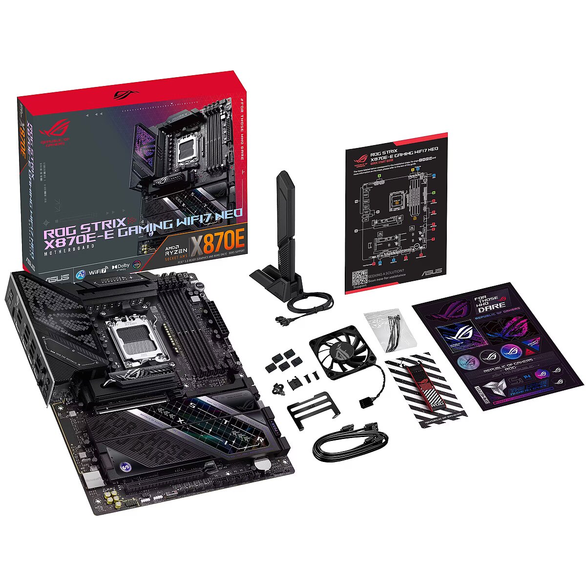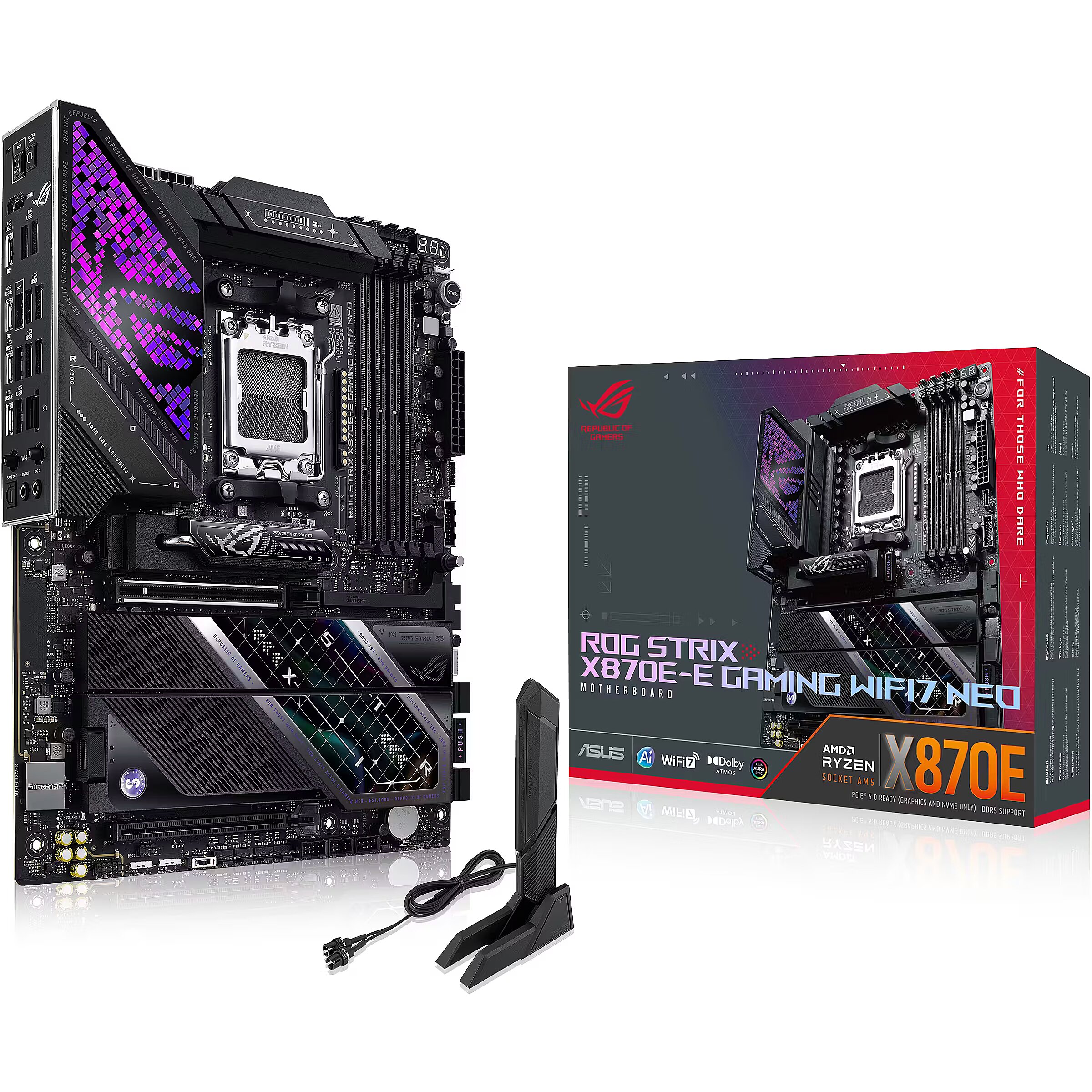 LongSummaryDescription - ASUS ROG STRIX X870E-E GAMING WIFI7 NEO. Processor manufacturer: AMD, Processor socket: Socket AM5, Compatible processor series: AMD Ryzen 9000 Series, AMD Ryzen 8000 Series, AMD Ryzen 7000 Series. Supported memory types: DDR5-SDRAM, Maximum internal memory: 256 GB, Memory slots type: DIMM. Supported storage drive interfaces: SATA III, M.2, Supported storage drive types: HDD & SSD, RAID levels: 0, 1, 5, 10. Ethernet interface type: 5 Gigabit Ethernet, Top Wi-Fi standard: Wi-Fi 7 (802.11be), Wi-Fi standards: Wi-Fi 7 (802.11be). Component for: PC, Motherboard form factor: ATX, Motherboard chipset family: AMD