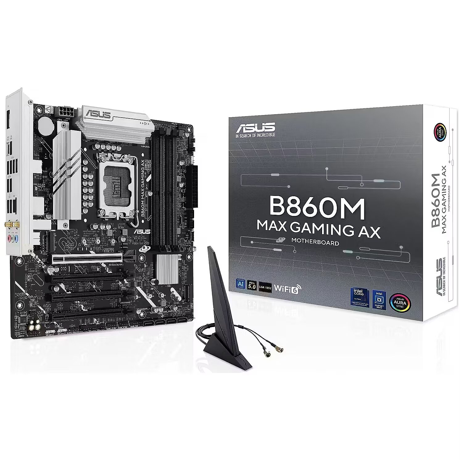 LongSummaryDescription - ASUS B860M MAX GAMING AX. Processor manufacturer: Intel, Processor socket: LGA 1851 (Socket V1), Compatible processor series: Intel Core Ultra (Series 2). Supported memory types: DDR5-SDRAM, Maximum internal memory: 256 GB, Memory slots type: DIMM. Supported storage drive interfaces: PCI Express 4.0, PCI Express 5.0, Supported storage drive types: HDD & SSD, RAID levels: 0, 1, 5, 10. Maximum resolution: 3840 x 2160 pixels. Ethernet interface type: 2.5 Gigabit Ethernet, Top Wi-Fi standard: Wi-Fi 6 (802.11ax), Wi-Fi standards: Wi-Fi 6 (802.11ax)