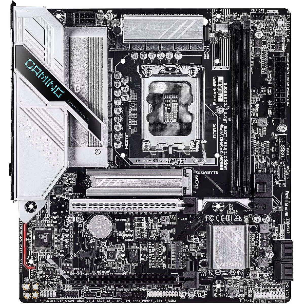Summary - GIGABYTE B860M GAMING WIFI6 Motherboard - Intel Core Ultra Series CPUs, 8+1+2 Phases VRM, up to 9066MHz DDR5, 1xPCIe 5.0 + 1xPCIe 4.0 M.2, 2.5GbE LAN, WIFI 6, USB 3.2 Gen 1. Processor manufacturer: Intel, Processor socket: LGA 1851 (Socket V1), Compatible processor series: Intel® Core™ Ultra (Series 1), Intel Core Ultra (Series 2). Supported memory types: DDR5-SDRAM, Maximum internal memory: 128 GB, Memory slots type: DIMM. Supported storage drive interfaces: M.2, SATA III, Supported storage drive types: HDD & SSD, RAID levels: 0, 1, 5, 10. Maximum resolution: 4096 x 2160 pixels. Ethernet interface type: 2.5 Gigabit Ethernet, LAN controller: Realtek RTL8125, Top Wi-Fi standard: Wi-Fi 6E (802.11ax)