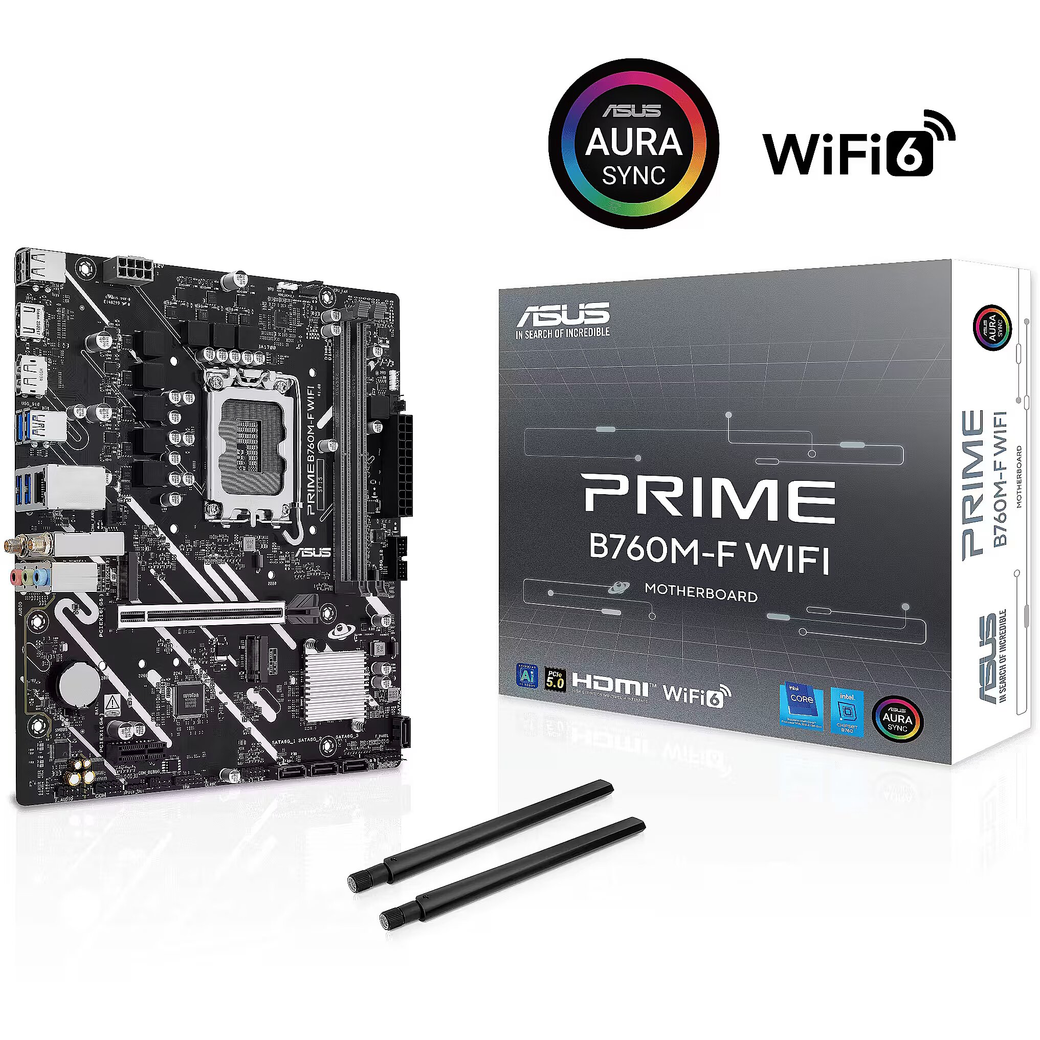 LongSummaryDescription - ASUS PRIME B760M-F WIFI. Processor manufacturer: Intel, Processor socket: LGA 1700, Compatible processor series: Intel® Celeron®, Intel® Pentium® Gold, Intel® Core™ i3, Intel® Core™ i5, Intel® Core™.... Supported memory types: DDR5-SDRAM, Maximum internal memory: 96 GB, Memory slots type: DIMM. Supported storage drive interfaces: M.2, SATA III, Supported storage drive types: HDD & SSD, RAID levels: 0, 1, 5, 10. Ethernet interface type: 2.5 Gigabit Ethernet, Top Wi-Fi standard: Wi-Fi 6 (802.11ax). Component for: PC, Motherboard form factor: micro ATX, Motherboard chipset family: Intel