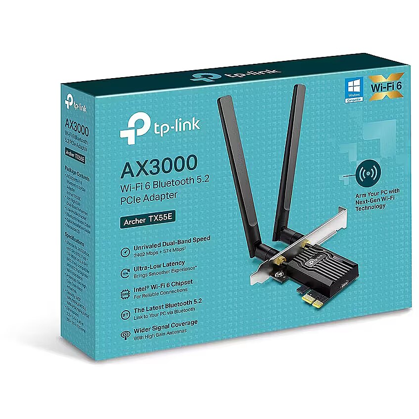 Description - TP-LINK ARCHER TX55E AX3000 Wi-Fi 6 Bluetooth 5.2 PCIe Adapter Unrivalled Wi-Fi 6 Speed Breaks the gigabit barrier with speed up to 2402 Mbps (5 GHz) + 574 Mbps (2.4 GHz) Smoother Experience 75% lower latency ensures ultra-responsive gaming, uninterrupted video chatting, and seamless live streaming Reliable Connections Intel Wi-Fi 6 chipset brings faster and clearer Wi-Fi to fully unlock the potential of your Wi-Fi 6 router Wider Signal Coverage Connect to your Wi-Fi in more parts of your home with two external high-gain antennas ensuring greater coverage and enhanced stability Bluetooth 5.2 The latest Bluetooth technology achieves Faster Speed and Broader Coverage than the previous version Improved Security The latest security enhancements WPA3 provides enhanced protection in personal password safety Fine Crafting Specialized gold plating is crafted to improve stability and reliability even in hot environments Backward Compatibility Full support for 802.11ac/a/b/g/n standards
