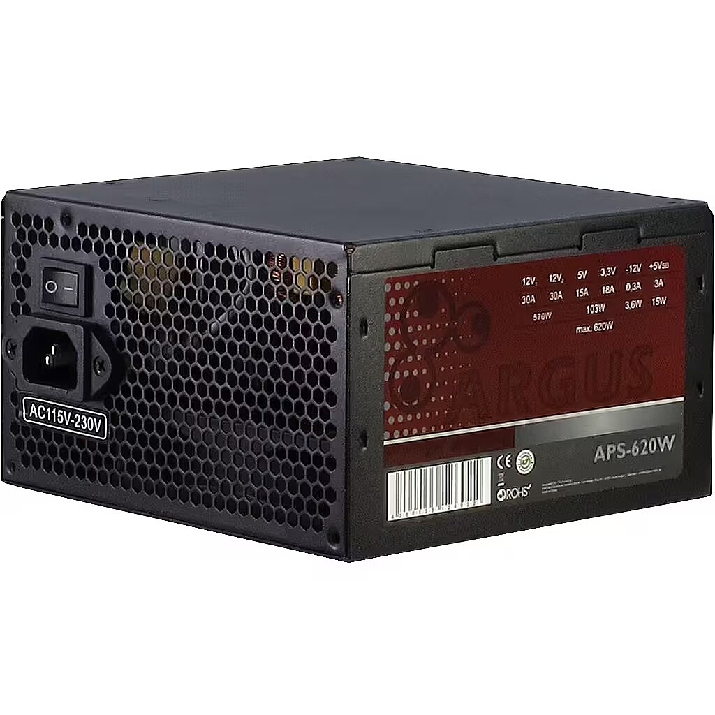 ProductDescription - Power Supply INTER-TECH Argus APS 620W, efficiency 86.3%, dual rail (30A/30A), 120 mm silent fan with automatic control, 1x6+2pinPCIE, 4xSATA, 4xMolex, 1xFloppy, 1x4+4pinEPS12V, Active PFC, OVP/SCP/OPP/UVP/OS protection