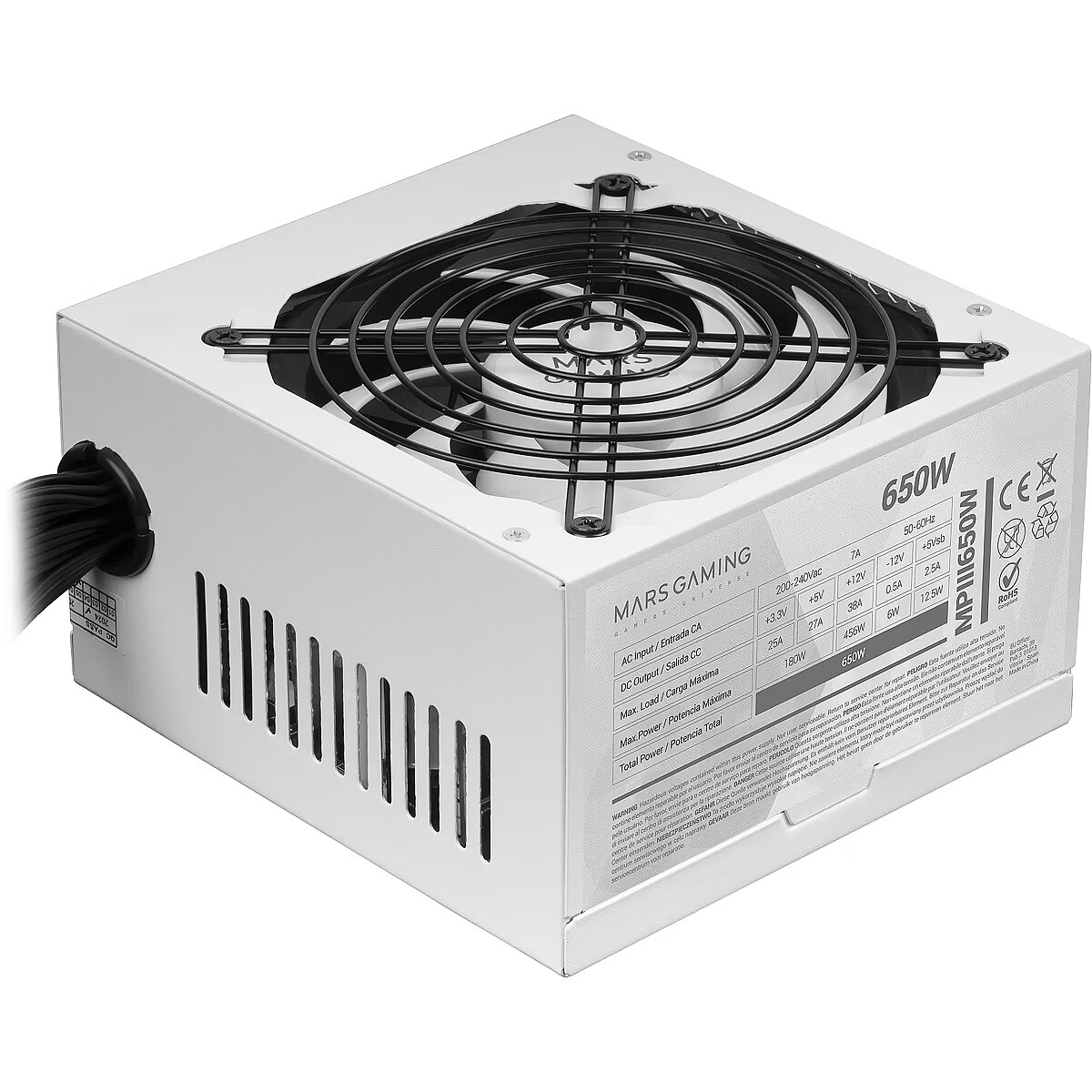 LongSummaryDescription - Mars Gaming MPIII650. Total power: 650 W, AC input voltage: 200 - 240 V, AC input frequency: 50/60 Hz. Motherboard power connector: 20+4 pin ATX, Cabling type: Non-Modular. Purpose: PC, Power supply unit (PSU) form factor: ATX, Noise level: 14 dB. Product colour: White, Cooling type: Active, Fan diameter: 12 cm. Compliance certificates: CE, RoHS