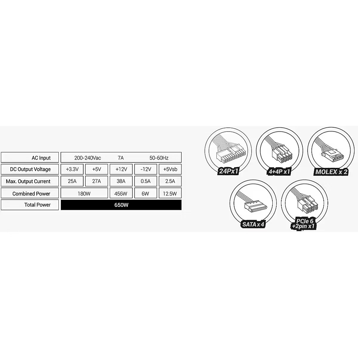 Voltage: +3.3V - 25A / +5V - 27A / +12V - 38A / -12V - 0.5A / +5VSB - 2.5A