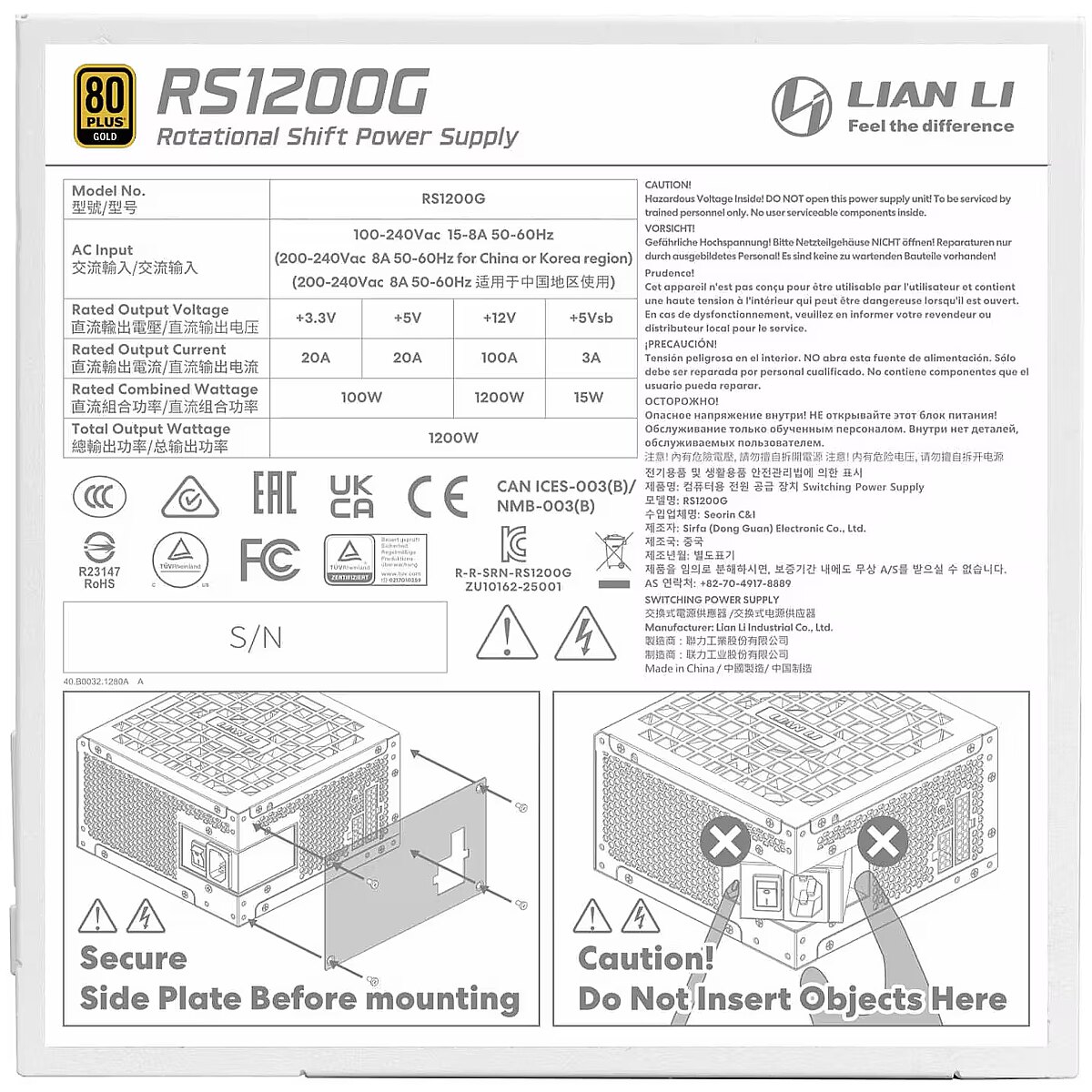 Ostettavissa on Lian Li-valmistajan virtalähde, jonka 1200W teho. Tuotteelle on myönnetty 80 PLUS Platinum -energiatehokkuussertifikaatti.