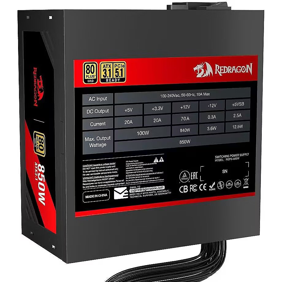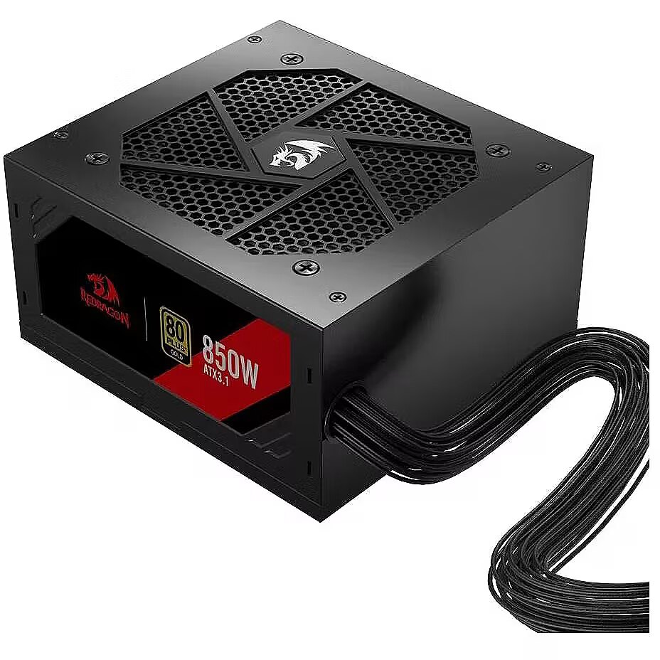 Tässä Redragon-merkkisessä virtalähteessä on 80 PLUS Gold -energiatehokkuussertifikaatti ja 850W tehoutput.