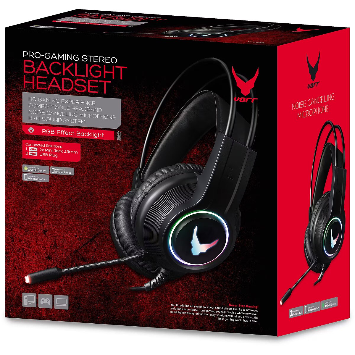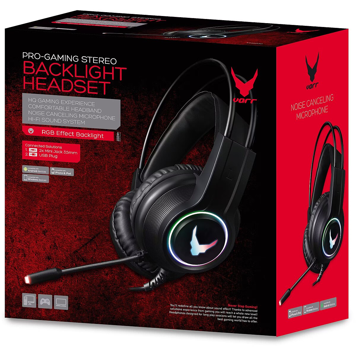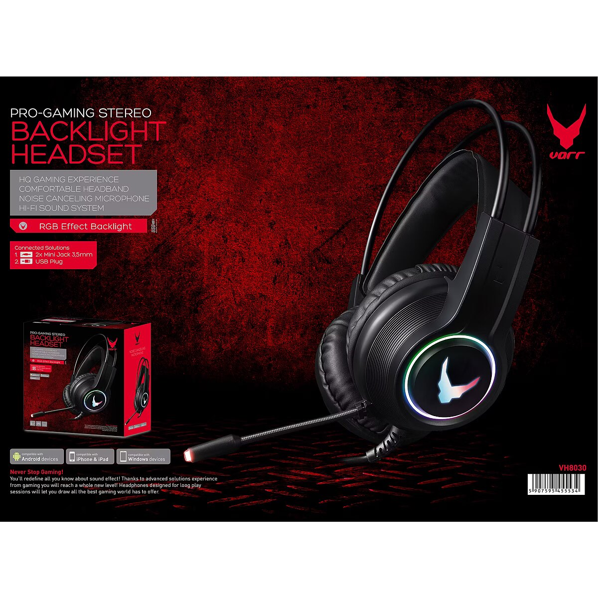 Title - Varr Pro Gaming 3.5mm Headset with RGB Backlight, Microphone Boom (with illuminated tip, noise reduction function and 360° rotation), 15mW speakers, 2x 3.5mm, Integrated 2.1m cable, Black