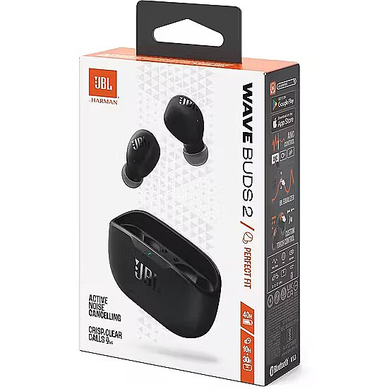 Sound: Signature JBL Deep Bass sound for powerful low frequencies Dynamic 8mm drivers for clear and rich audio Noise Cancellation: Passive noise cancellation technology Ambient Aware function for environmental awareness TalkThru mode for conversations without removing the earbuds Microphone: Built-in microphones with noise reduction technology for clear calls Control: Touch controls for music playback, calls, and voice assistant Supports Google Assistant and Siri Battery Life: Long-lasting playtime without recharging Charging case provides extra battery life Fast charging for convenient use Additional Features: IPX4 water resistance (splash and sweat proof) Ergonomic design for all-day comfort Compatible with iOS and Android devices Package Contents: JBL Wave Buds 2 Earbuds Charging case Charging cable Ear tips in different sizes User manual