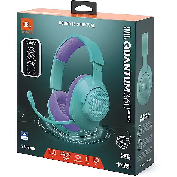 LongSummaryDescription - JBL QUANTUM 360. Product type: Headset. Connectivity technology: Wireless, Bluetooth. Recommended usage: Gaming. Headphone frequency: 20 - 20000 Hz. Weight: 255 g. Product colour: Teal