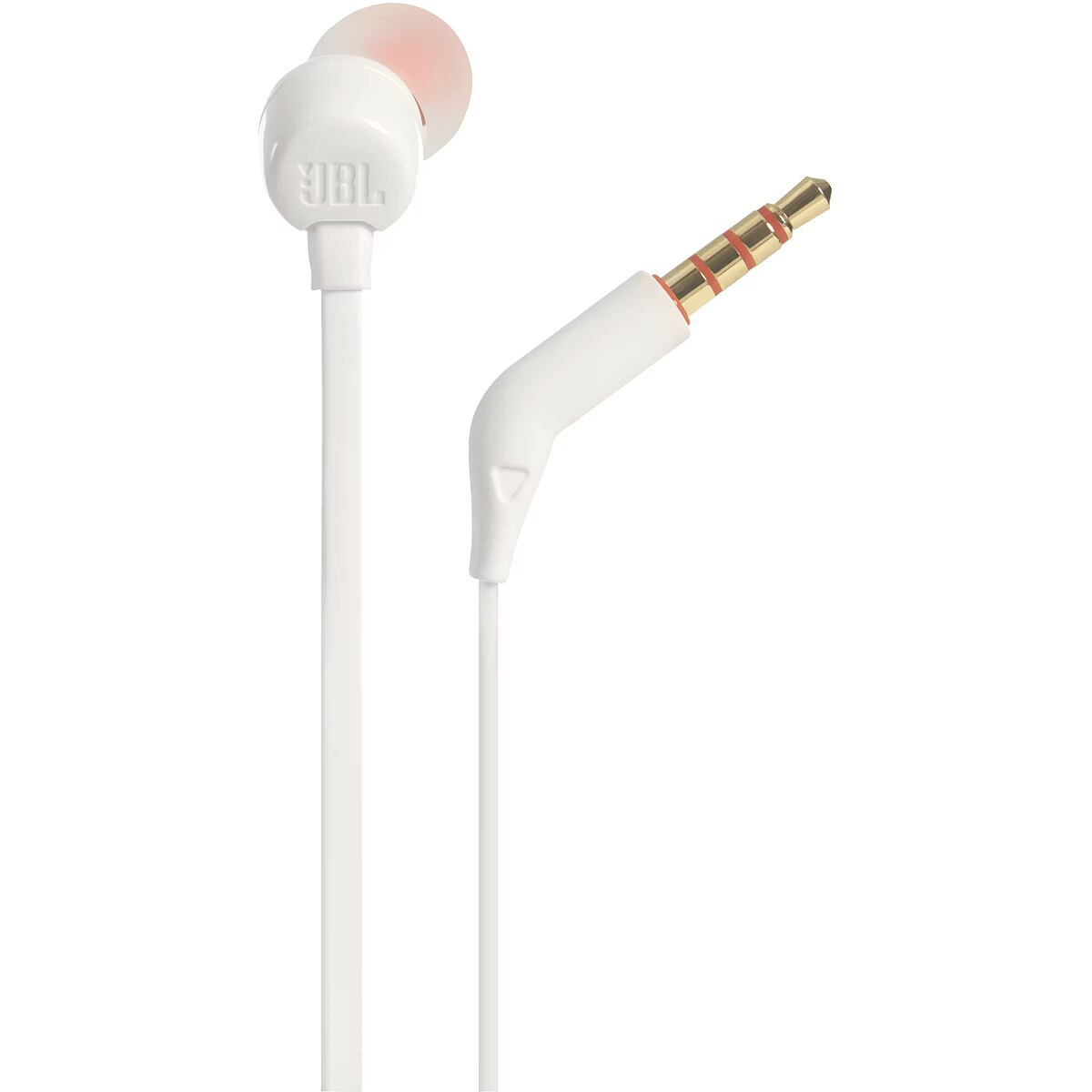 LongDesc - Introducing JBL T110 in-ear headphones. They’re lightweight, comfortable and compact. Under the durable earpiece housing, a pair of 9mm drivers punch out some serious bass, reproducing the JBL Pure Bass sound you’ve experienced in concert halls, arenas and recording studios around the world. In addition, the single-button remote on a tangle-free flat cable lets you control music playback, as well as answer calls on the fly with a built-in microphone. Making the JBL T110 your everyday companion for work, at home and on the road.For over 60 years, JBL has engineered the precise, impressive sound found in big venues around the world. These headphones reproduce that same JBL sound, punching out bass that’s both deep and powerful.