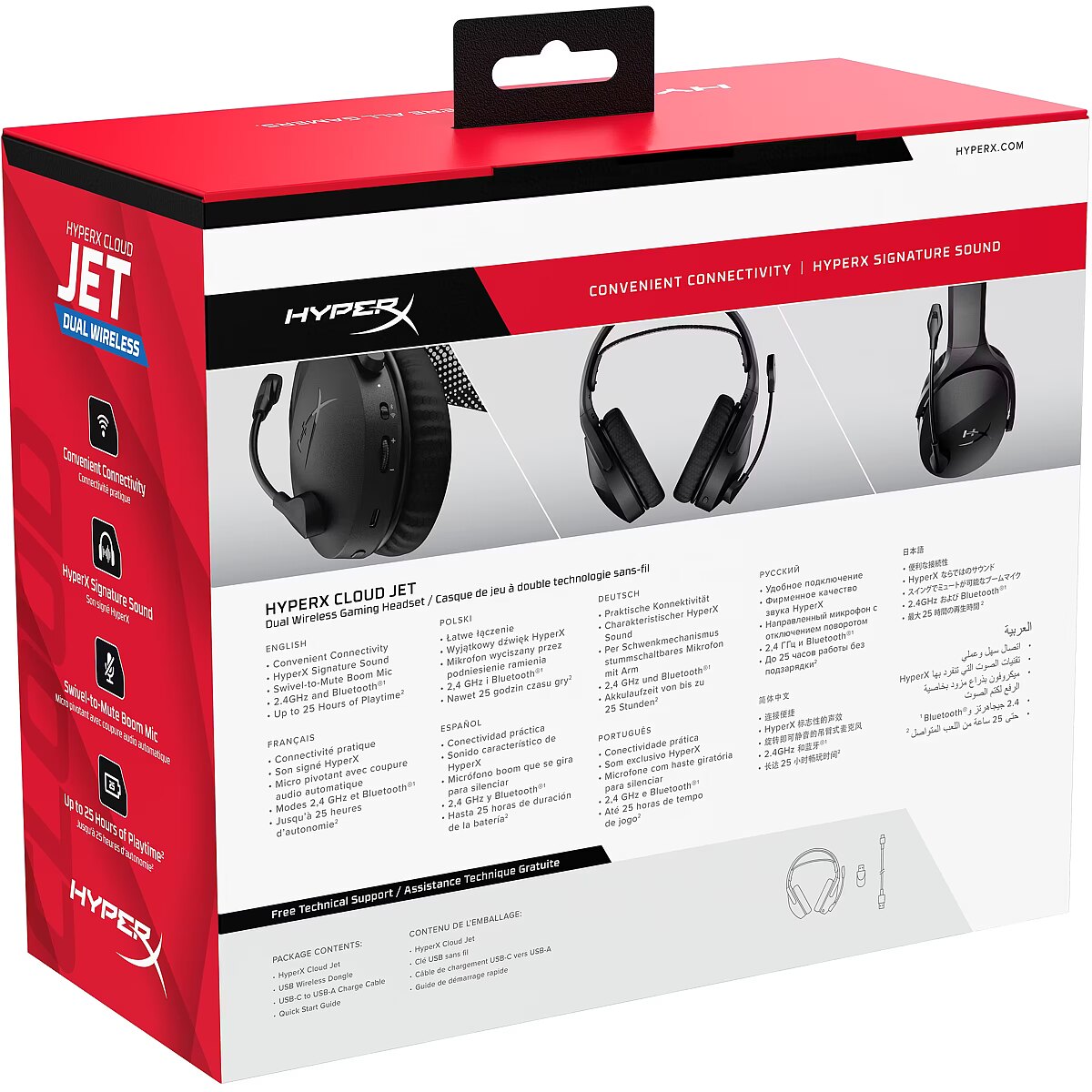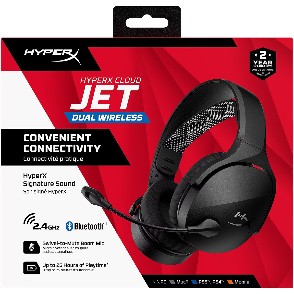 LongDesc - Sleek Design. Enhanced Experience.Designed for both rising gamers and those upgrading from entry-level gear, the HyperX Cloud Jet dual wireless headset offers a seamless experience with 2.4GHz and Bluetooth 5.3 connectivity. Effortlessly switch between PC, console, and mobile devices while enjoying rich audio delivered by 40mm drivers for an immersive gaming experience. Stay connected with a swivel-to-mute boom mic that ensures clear communication with your squad. With up to 25 hours of battery life[1], you can dive into longer gaming sessions without interruptions. The onboard controls make it easy to adjust the volume, mute the mic, and toggle between connections. Plus, its lightweight design, breathable mesh earpads, and elastic suspension headband provide ultimate comfort for marathon gaming. Elevate your gaming experience with the HyperX Cloud Jet!