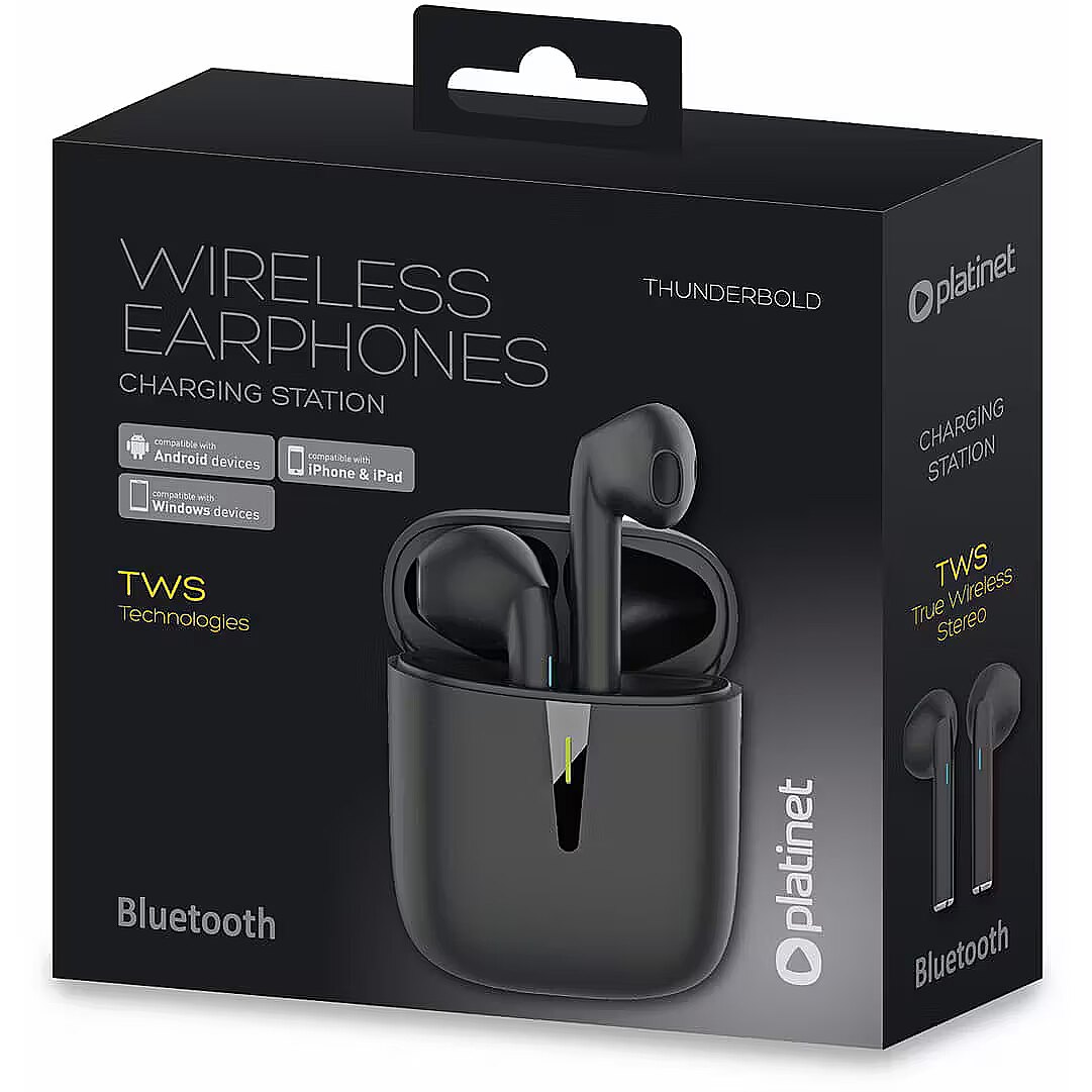 LongDesc - PLATINET BLUETOOTH V5.0 EARPHONES + CHARGING STATION PM1010 THUNDERBOLD BLACK are completely wireless in-ear headphones that offer high-quality sound thanks to the use of good quality transducers and modern Bluetooth 5.0 technology.FORGET ABOUT RESTRICTIONSDon't be restrained by the hoses that restrict your movements. Bluetooth 5.0 and TWS (True Wireless Stereo) technologies make the AURA headphones fully wireless. You will gain freedom of movement, which will facilitate listening to your favorite songs while practicing any physical activity.BLUETOOTH 5.0Wireless Bluetooth 5 connectivity means faster transfer, greater range and better quality of transmitted sound. The headphones connect to your devices instantly and the connection is very stable.DO NOT MISS AN IMPORTANT CONNECTIONWhen the phone rings, you won't have to stop, take it out of your pocket and hold the conversation by holding it to your ear. Thanks to the built-in microphone and function buttons, you can answer the call with one click. A high-quality, sensitive microphone takes care of the comfort of conversation, which collects sound very well and eliminates unnecessary background noise.CASE WITH A POWERBANKThe aesthetic case acts as a headphone compartment, thanks to which you will never lose them, but it also has a built-in rechargeable battery that is able to charge the headphones' batteries up to four times.